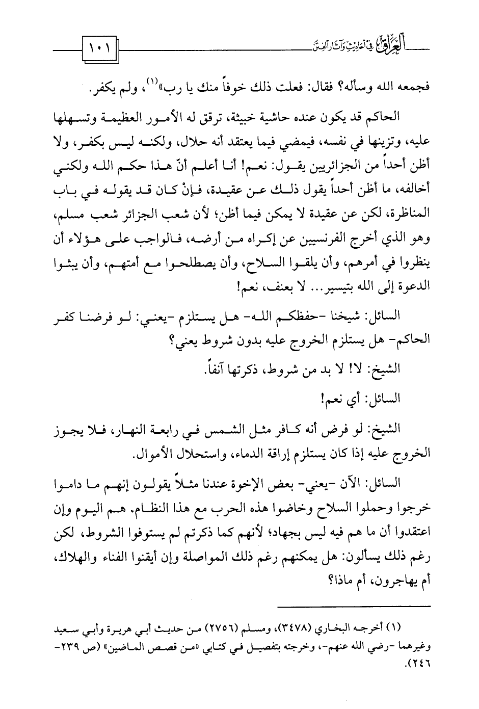 الحاكم قد يكون عنده حاشية خبيثة، ترقق له الأمور العظيمة وتسهلها عليه، وتزينها في نفسه، فيمضي فيما يعتقد أنه حلال، ولكنه ليس بكفر، ولا أظن أحداً من الجزائريين يقول: نعم! أنا أعلم أنّ هذا حكم الله ولكني أخالفه، ما أظن أحداً يقول ذلك عن عقيدة، فإنْ كان قد يقوله في باب المناظرة، لكن عن عقيدة لا يمكن فيما أظن؛ لأن شعب الجزائر شعب مسلم، وهو الذي أخرج الفرنسيين عن إكراه من أرضه، فالواجب على هؤلاء أن ينظروا في أمرهم، وأن يلقوا السلاح، وأن يصطلحوا مع أمتهم، وأن يبثوا الدعوة إلى الله بتيسير ... لا بعنف، نعم!