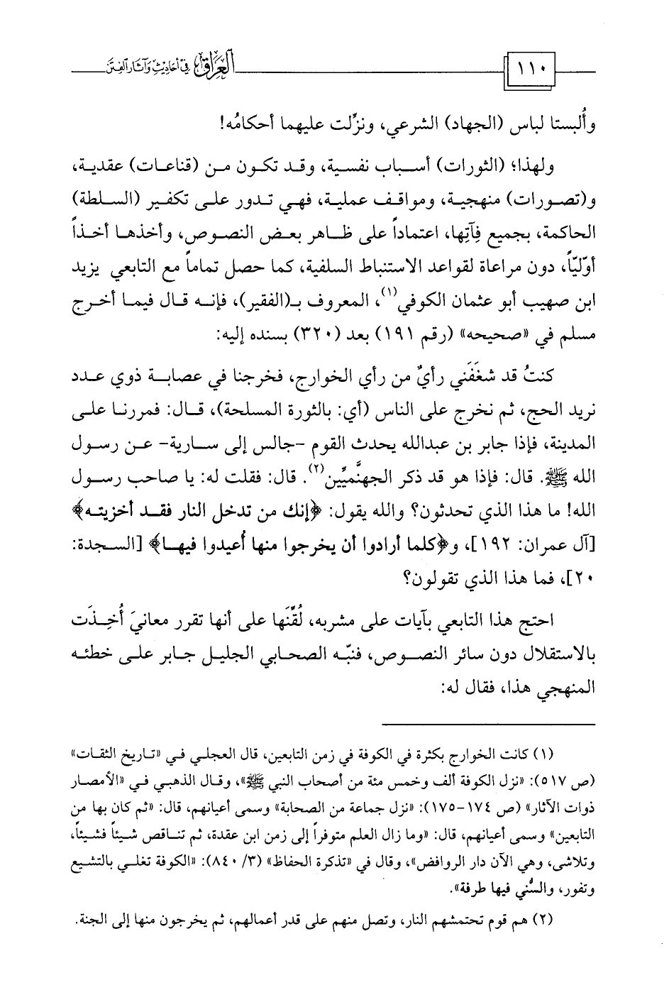 (¬1) كانت الخوارج بكثرة في الكوفة في زمن التابعين، قال العجلي في «تاريخ الثقات» (ص 517) : «نزل الكوفة ألف وخمس مئة من أصحاب النبي - صلى الله عليه وسلم -» ، وقال الذهبي في «الأمصار ذوات الآثار» (ص 174-175) : «نزل جماعة من الصحابة» وسمى أعيانهم، قال: «ثم كان بها من التابعين» وسمى أعيانهم، قال: «وما زال العلم متوفراً إلى زمن ابن عقدة، ثم تناقص شيئاً فشيئاً، وتلاشى، وهي الآن دار الروافض» ، وقال في «تذكرة الحفاظ» (3/840) : «الكوفة تغلي بالتشيع وتفور، والسُّني فيها طرفة» .
