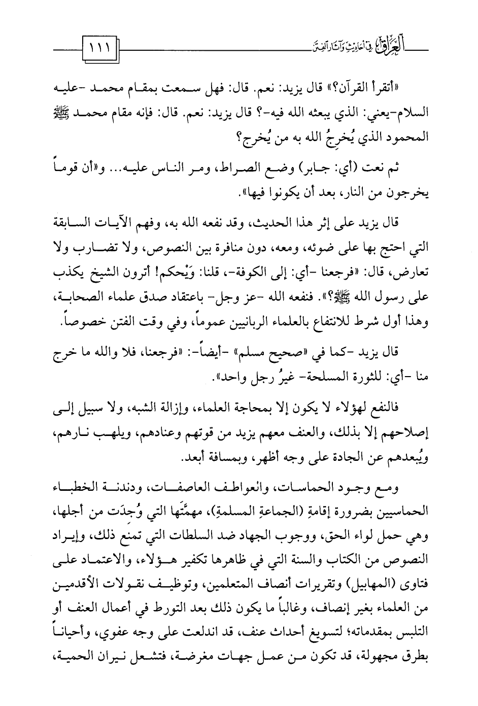 «أتقرأ القرآن؟» قال يزيد: نعم. قال: فهل سمعت بمقام محمد -عليه السلام-يعني: الذي يبعثه الله فيه-؟ قال يزيد: نعم. قال: فإنه مقام محمد صلى الله عليه وسلم المحمود الذي يُخرِجُ الله به من يُخرج؟