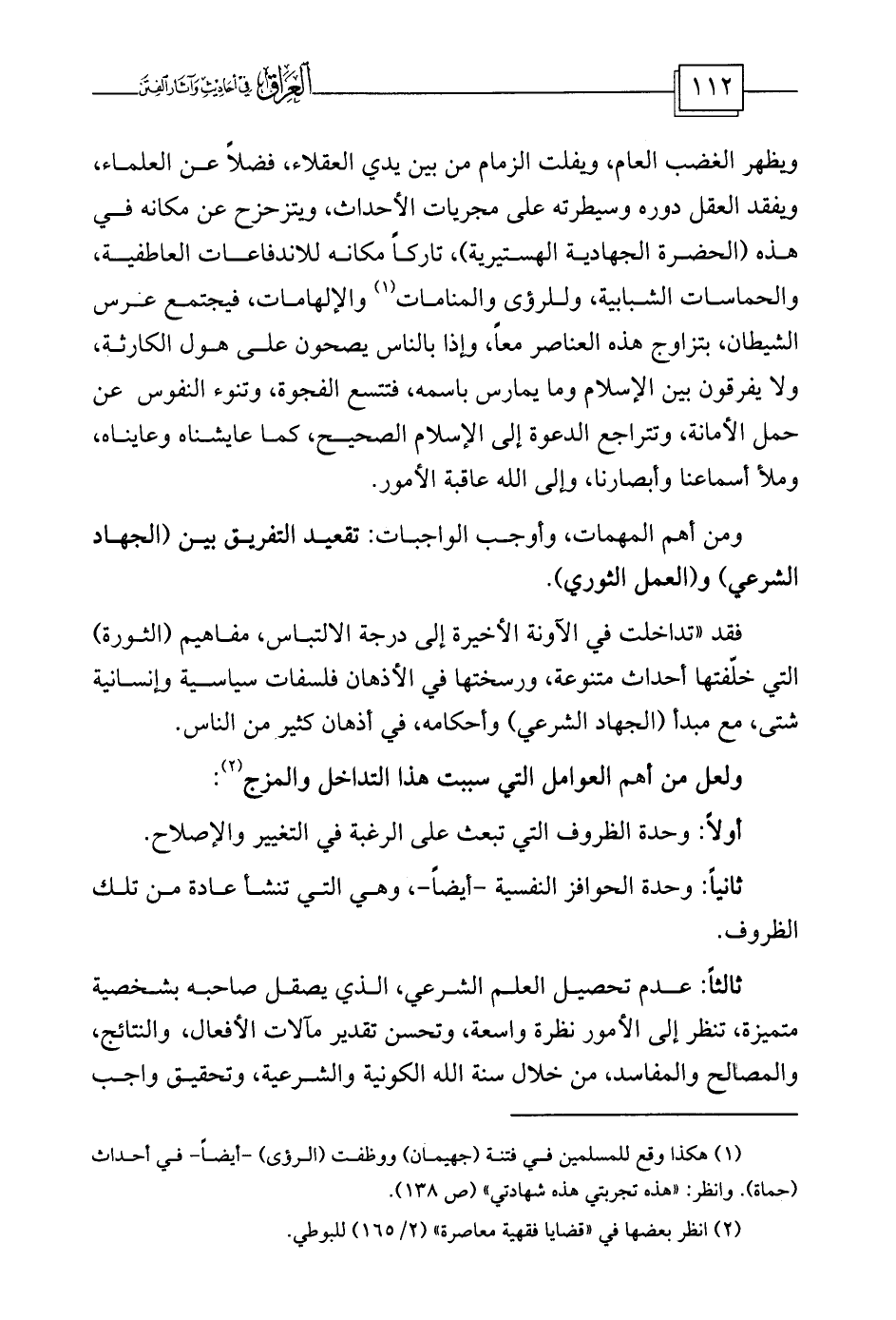 فقد «تداخلت في الآونة الأخيرة إلى درجة الالتباس، مفاهيم (الثورة) التي خلّفتها أحداث متنوعة، ورسختها في الأذهان فلسفات سياسية وإنسانية شتى، مع مبدأ (الجهاد الشرعي) وأحكامه، في أذهان كثير من الناس.