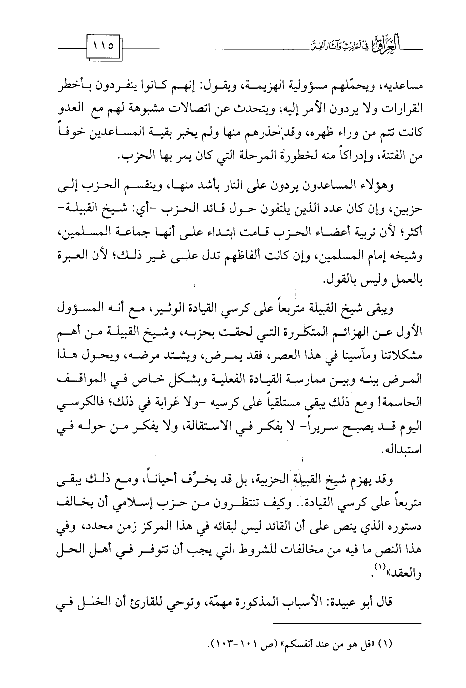 وقد يهزم شيخ القبيلة الحزبية، بل قد يخرِّف أحياناً، ومع ذلك يبقى متربعاً على كرسي القيادة.. وكيف تنتظرون من حزب إسلامي أن يخالف دستوره الذي ينص على أن القائد ليس لبقائه في هذا المركز زمن محدد، وفي هذا النص ما فيه من مخالفات للشروط التي يجب أن تتوفر في أهل الحل والعقد» (¬1) .