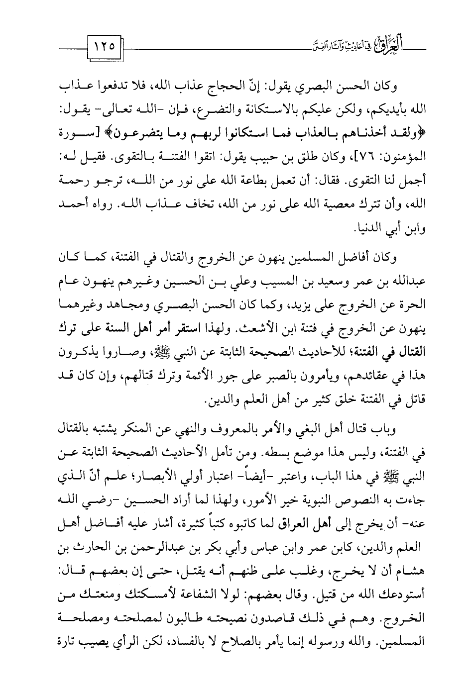 وكان أفاضل المسلمين ينهون عن الخروج والقتال في الفتنة، كما كان عبد الله بن عمر وسعيد بن المسيب وعلي بن الحسين وغيرهم ينهون عام الحرة عن الخروج على يزيد، وكما كان الحسن البصري ومجاهد وغيرهما ينهون عن الخروج في فتنة ابن الأشعث. ولهذا استقر أمر أهل السنة على ترك القتال في الفتنة؛ للأحاديث الصحيحة الثابتة عن النبي صلى الله عليه وسلم، وصاروا يذكرون هذا في عقائدهم، ويأمرون بالصبر على جور الأئمة وترك قتالهم، وإن كان قد قاتل في الفتنة خلق كثير من أهل العلم والدين.