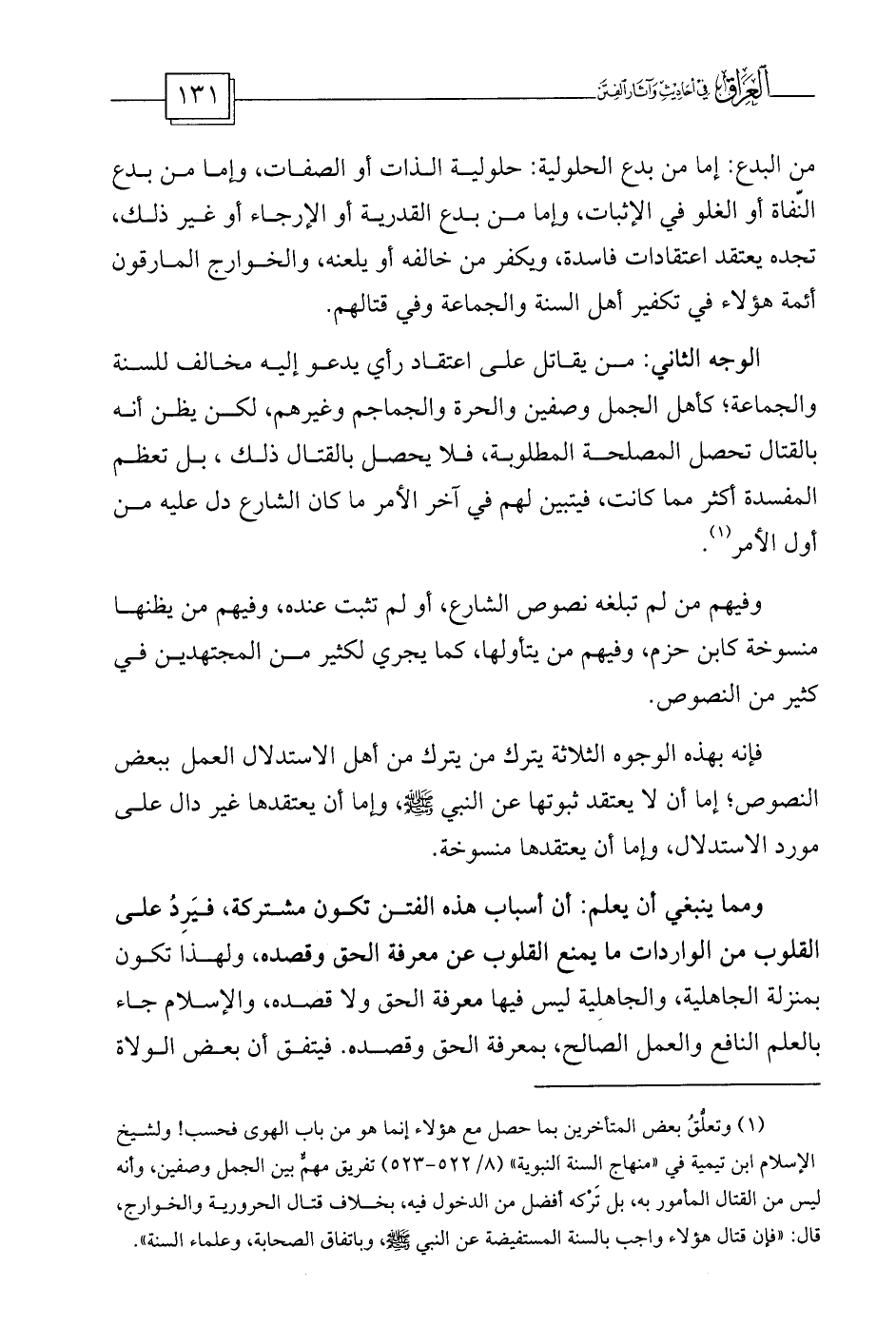 (¬1) وتعلُّقُ بعض المتأخرين بما حصل مع هؤلاء إنما هو من باب الهوى فحسب! ولشيخ الإسلام ابن تيمية في «منهاج السنة النبوية» (8/522-523) تفريق مهمٌّ بين الجمل وصفين، وأنه ليس من القتال المأمور به، بل تَرْكه أفضل من الدخول فيه، بخلاف قتال الحرورية والخوارج، قال: «فإن قتال هؤلاء واجب بالسنة المستفيضة عن النبي - صلى الله عليه وسلم -، وباتفاق الصحابة، وعلماء السنة» .