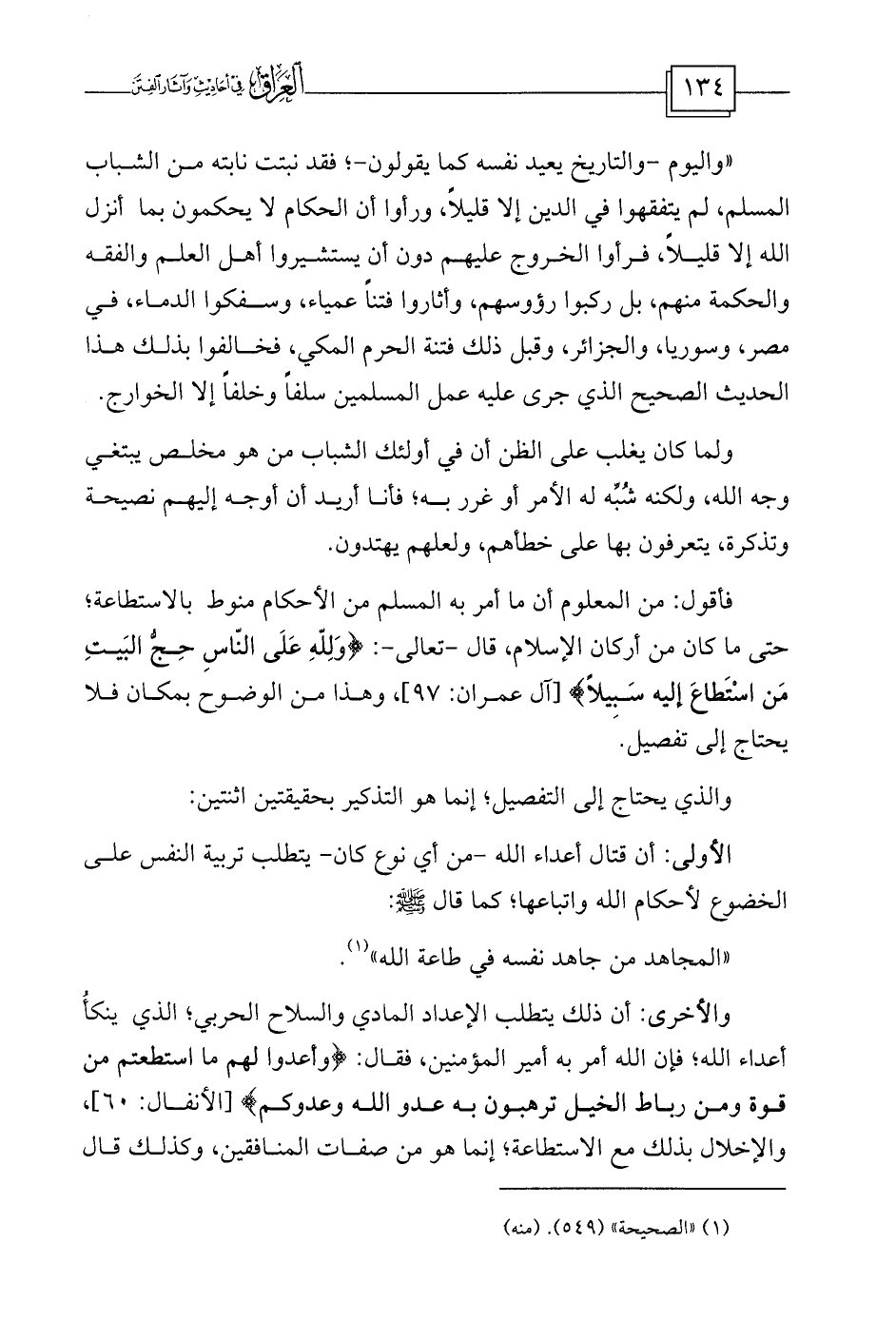 «واليوم -والتاريخ يعيد نفسه كما يقولون-؛ فقد نبتت نابته من الشباب المسلم، لم يتفقهوا في الدين إلا قليلاً، ورأوا أن الحكام لا يحكمون بما أنزل الله إلا قليلاً، فرأوا الخروج عليهم دون أن يستشيروا أهل العلم والفقه والحكمة منهم، بل ركبوا رؤوسهم، وأثاروا فتناً عمياء، وسفكوا الدماء، في مصر، وسوريا، والجزائر، وقبل ذلك فتنة الحرم المكي، فخالفوا بذلك هذا الحديث الصحيح الذي جرى عليه عمل المسلمين سلفاً وخلفاً إلا الخوارج.