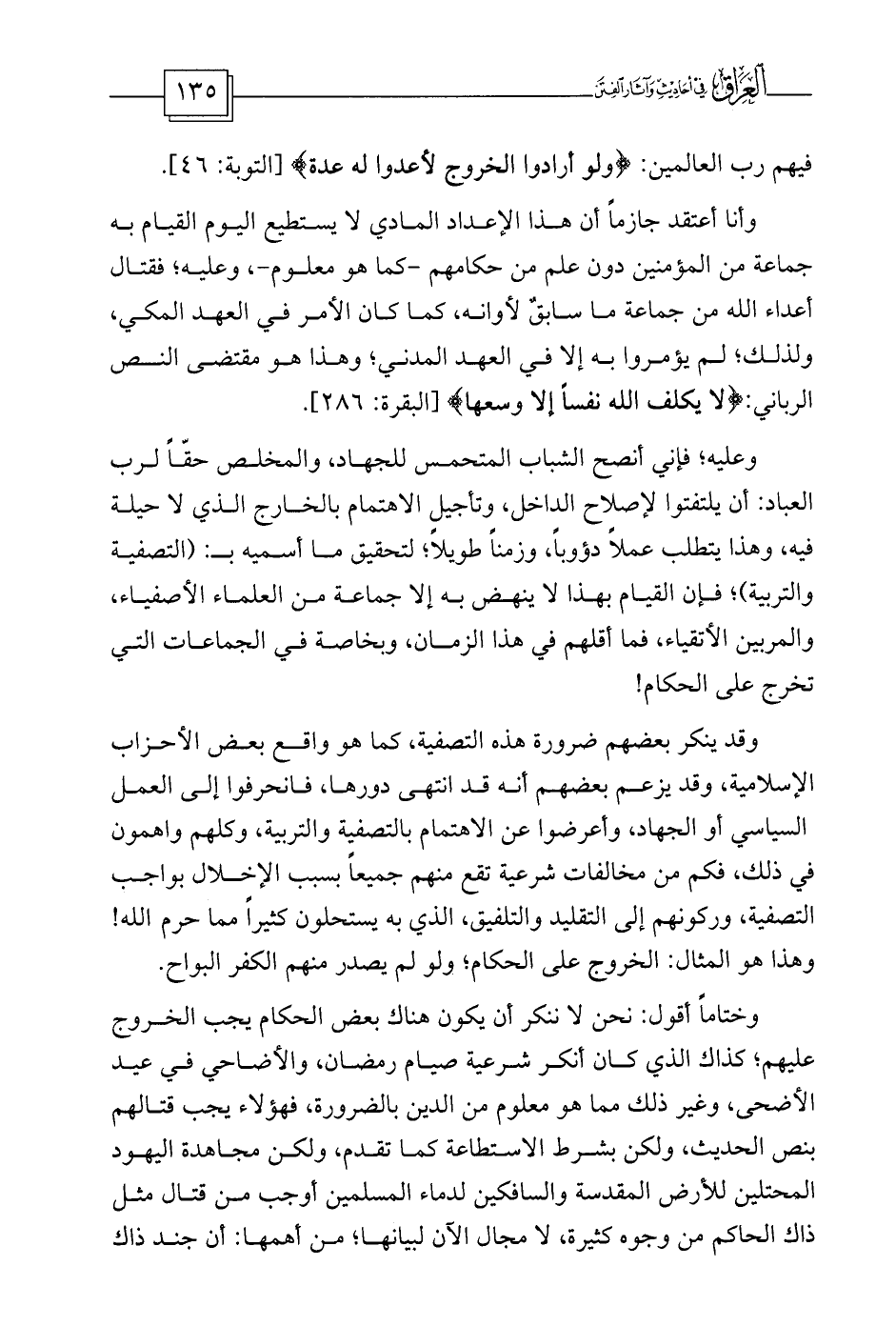 وعليه؛ فإني أنصح الشباب المتحمس للجهاد، والمخلص حقّاً لرب العباد: أن يلتفتوا لإصلاح الداخل، وتأجيل الاهتمام بالخارج الذي لا حيلة فيه، وهذا يتطلب عملاً دؤوباً، وزمناً طويلاً؛ لتحقيق ما أسميه بـ: (التصفية والتربية) ؛ فإن القيام بهذا لا ينهض به إلا جماعة من العلماء الأصفياء، والمربين الأتقياء، فما أقلهم في هذا الزمان، وبخاصة في الجماعات التي تخرج على الحكام!