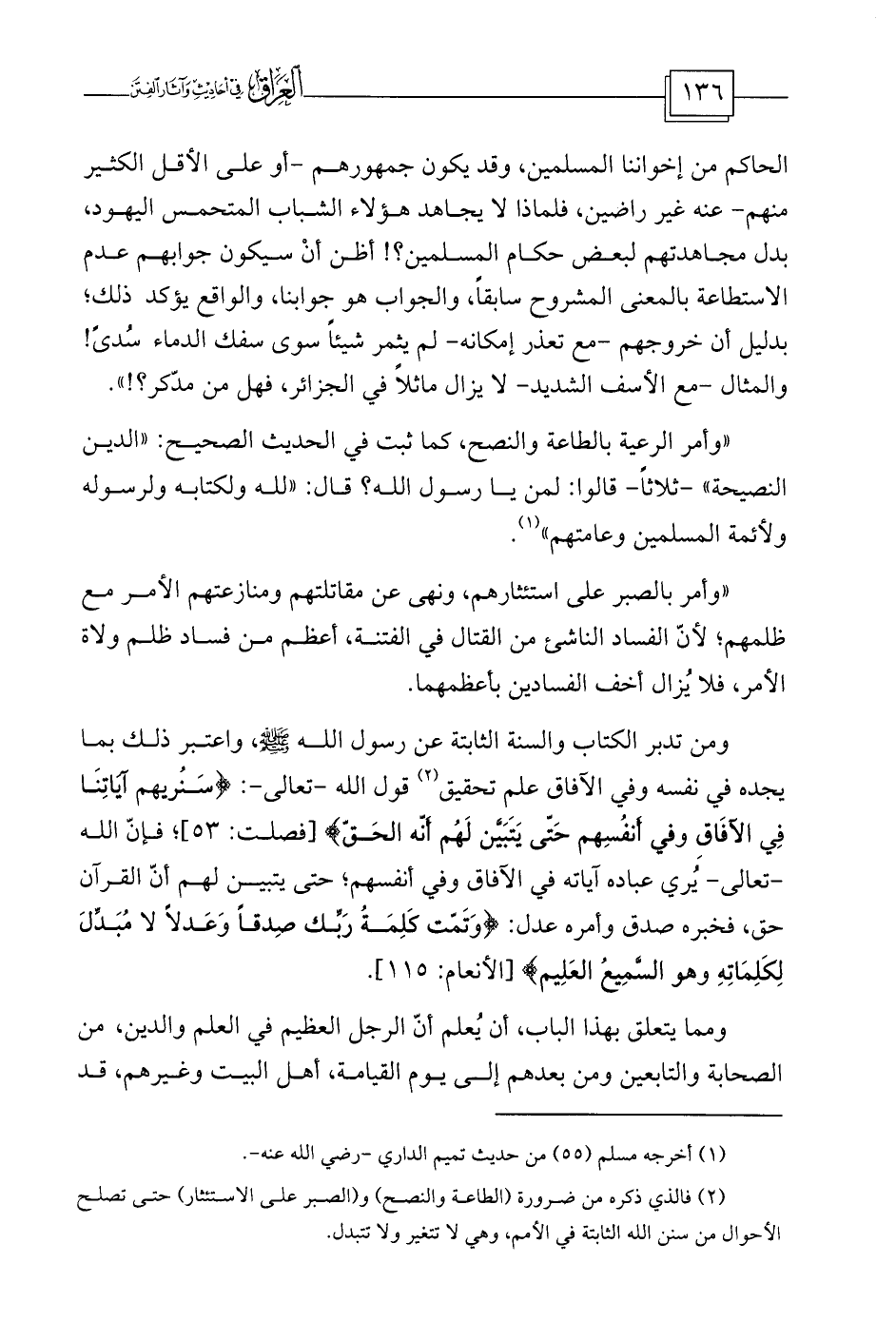 (¬2) فالذي ذكره من ضرورة (الطاعة والنصح) و (الصبر على الاستئثار) حتى تصلح الأحوال من سنن الله الثابتة في الأمم، وهي لا تتغير ولا تتبدل.