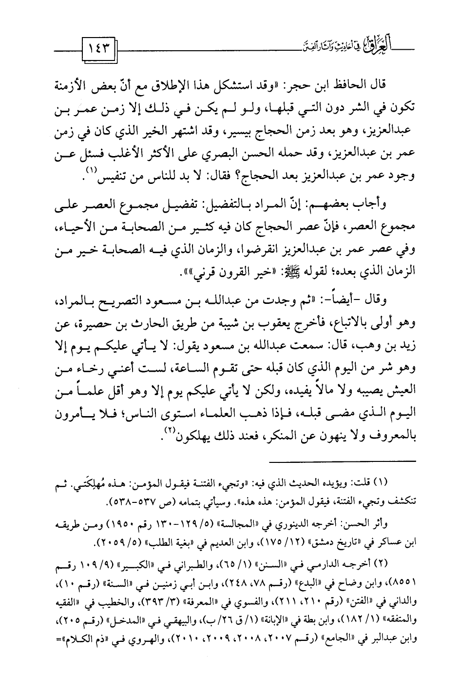 وأجاب بعضهم: إنّ المراد بالتفضيل: تفضيل مجموع العصر على مجموع العصر، فإنّ عصر الحجاج كان فيه كثير من الصحابة من الأحياء، وفي عصر عمر بن عبد العزيز انقرضوا، والزمان الذي فيه الصحابة خير من الزمان الذي بعده؛ لقوله صلى الله عليه وسلم: «خير القرون قرني» » .