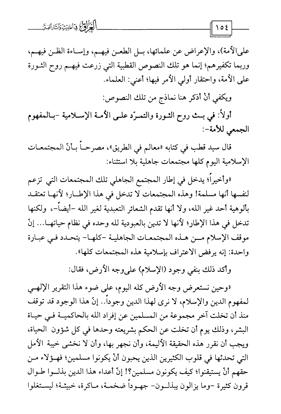 على الأمة) ، والإعراض عن علمائها، بل الطعن فيهم، وإساءة الظن فيهم، وربما تكفيرهم؛ إنما هو تلك النصوص القطبية التي زرعت فيهم روح الثورة على الأمة، واحتقار أولي الأمر فيها؛ أعني: العلماء.