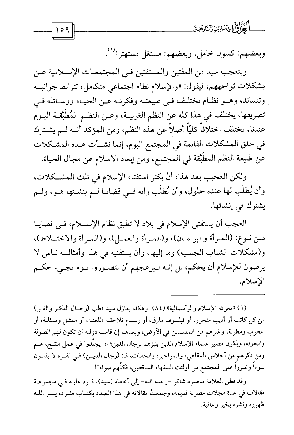 العجب أن يستفتى الإسلام في بلاد لا تطبق نظام الإسلام، في قضايا من نوع: (المرأة والبرلمان) ، و (المرأة والعمل) ، و (المرأة والاختلاط) ، و (مشكلات الشباب الجنسية) وما إليها، وأن يستفتيه في هذا وأمثاله ناس لا يرضون للإسلام أن يحكم، بل إنه ليزعجهم أن يتصوروا يوم يجيء حكم الإسلام.