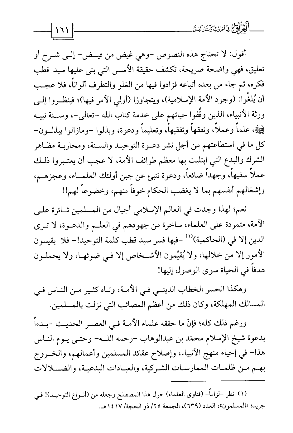 أقول: لا تحتاج هذه النصوص -وهي غيض من فيض- إلى شرح أو تعليق، فهي واضحة صريحة، تكشف حقيقة الأسس التي بنى عليها سيد قطب فكره، ثم جاء من بعده أتباعه فزادوا فيها من الغلو والتطرف ألواناً، فلا عجب أن يُلغُوا: (وجود الأمة الإسلامية) ، ويتجاوزا (أولي الأمر فيها) ؛ فينظروا إلى ورثة الأنبياء، الذين وقَّفوا حياتهم على خدمة كتاب الله -تعالى-، وسنة نبيه صلى الله عليه وسلم، علماً وعملاً، وتفقهاً وتفقيهاً، وتعليماً ودعوة، وبذلوا -ومازالوا يبذلون- كل ما في استطاعتهم من أجل نشر دعوة التوحيد والسنة، ومحاربة مظاهر الشرك والبدع التي ابتليت بها معظم طوائف الأمة، لا عجب أن يعتبروا ذلك عملاً سفيهاً، وجهداً ضائعاً، ودعوة تنبئ عن جبن أولئك العلماء، وعجزهم، وإشغالهم أنفسهم بما لا يغضب الحكام خوفاً منهم، وخضوعاً لهم!!