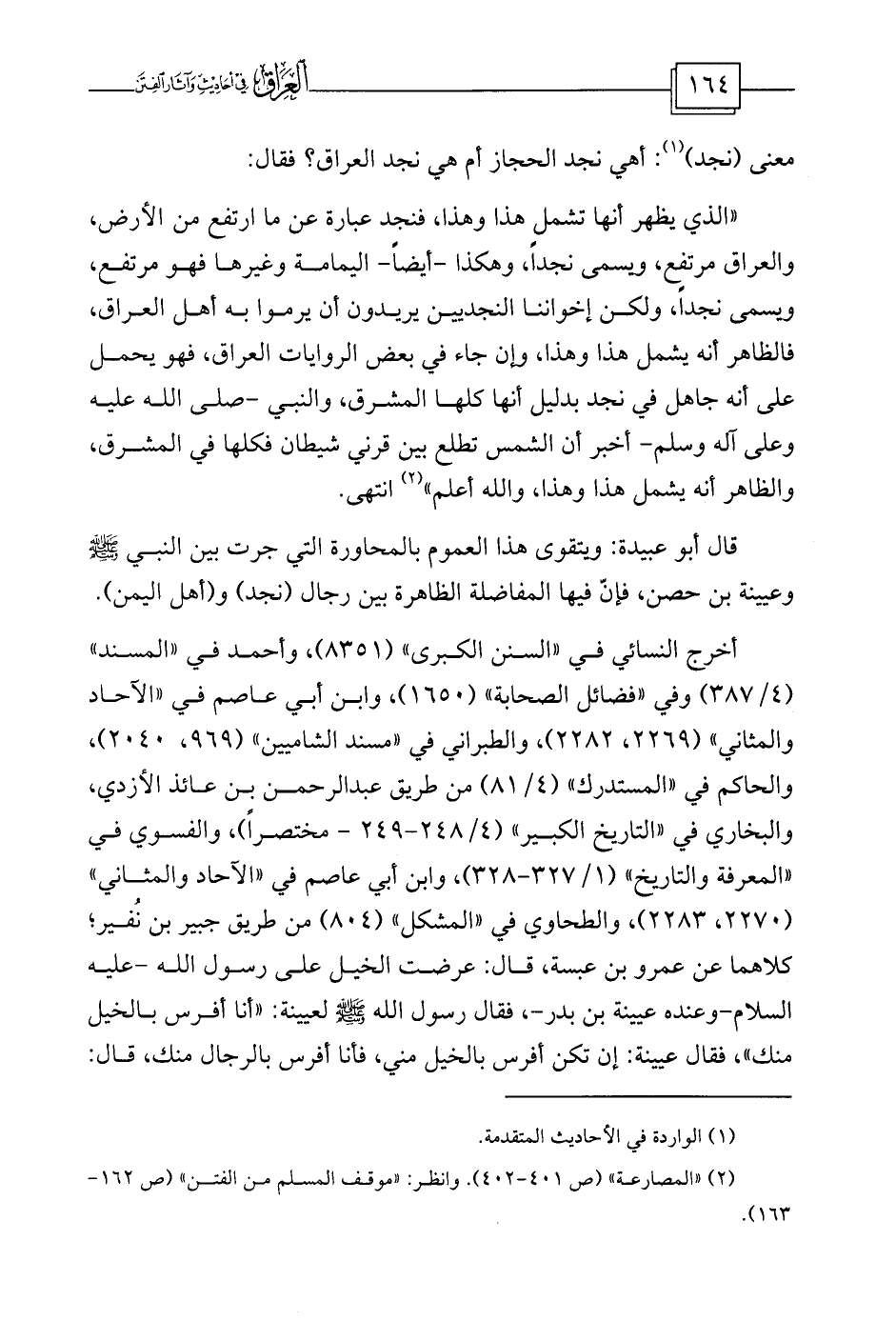 «الذي يظهر أنها تشمل هذا وهذا، فنجد عبارة عن ما ارتفع من الأرض، والعراق مرتفع، ويسمى نجداً، وهكذا -أيضاً- اليمامة وغيرها فهو مرتفع، ويسمى نجداً، ولكن إخواننا النجديين يريدون أن يرموا به أهل العراق، فالظاهر أنه يشمل هذا وهذا، وإن جاء في بعض الروايات العراق، فهو يحمل على أنه جاهل في نجد بدليل أنها كلها المشرق، والنبي -صلى الله عليه وعلى آله وسلم- أخبر أن الشمس تطلع بين قرني شيطان فكلها في المشرق، والظاهر أنه يشمل هذا وهذا، والله أعلم» (¬2) انتهى.