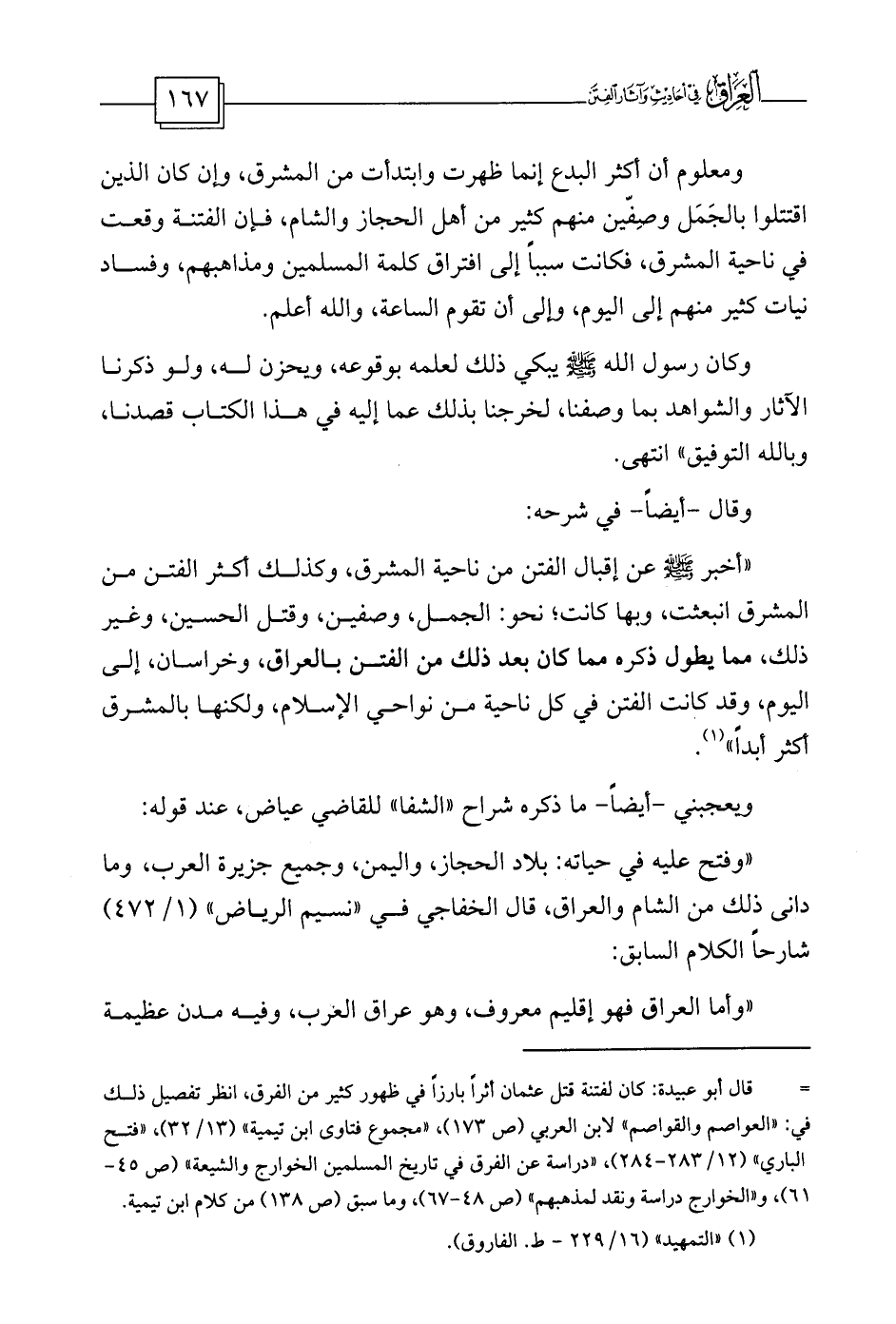 ومعلوم أن أكثر البدع إنما ظهرت وابتدأت من المشرق، وإن كان الذين اقتتلوا بالجَمَل وصِفّين منهم كثير من أهل الحجاز والشام، فإن الفتنة وقعت في ناحية المشرق، فكانت سبباً إلى افتراق كلمة المسلمين ومذاهبهم، وفساد نيات كثير منهم إلى اليوم، وإلى أن تقوم الساعة، والله أعلم.