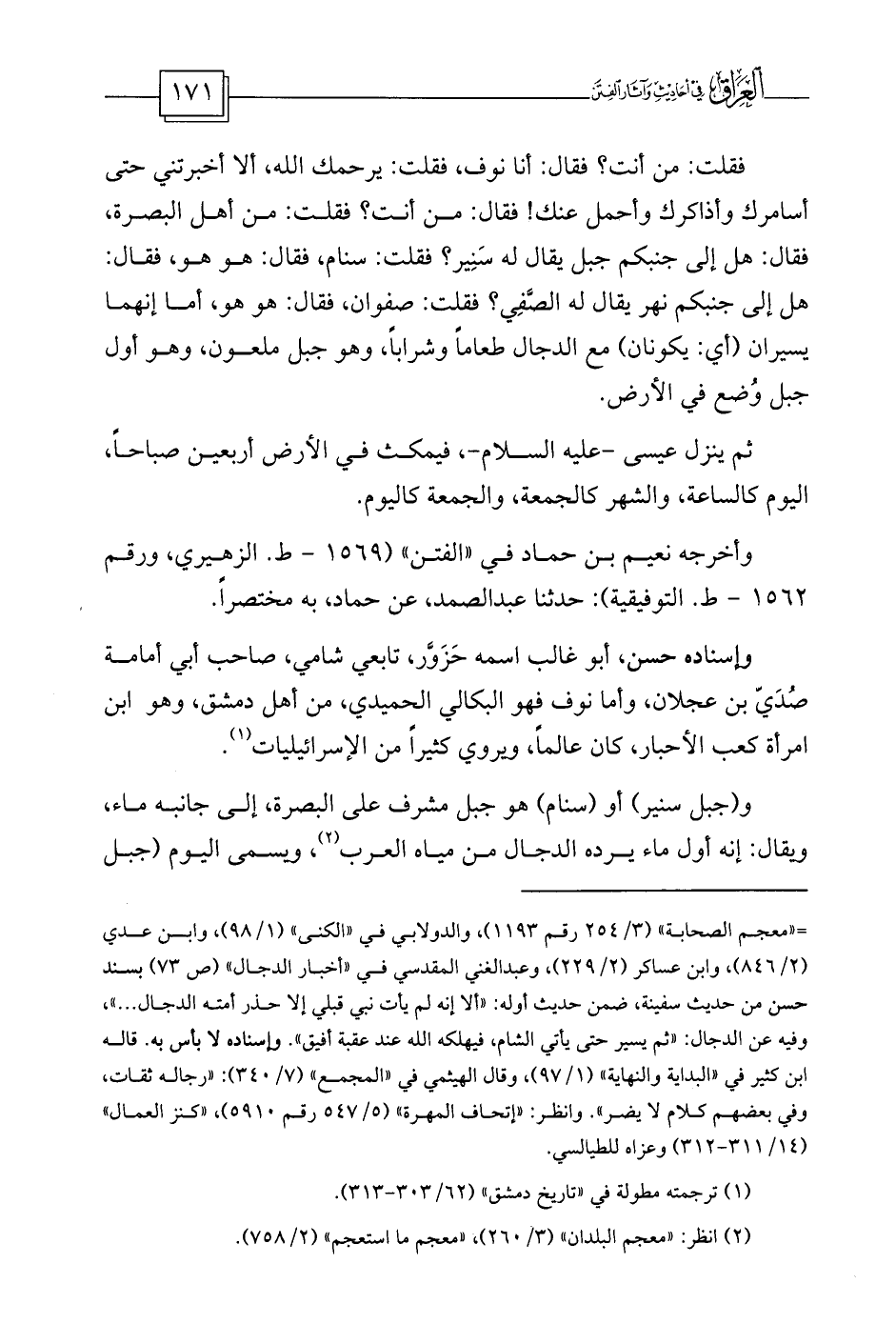 فقلت: من أنت؟ فقال: أنا نوف، فقلت: يرحمك الله، ألا أخبرتني حتى أسامرك وأذاكرك وأحمل عنك! فقال: من أنت؟ فقلت: من أهل البصرة، فقال: هل إلى جنبكم جبل يقال له سَنِير؟ فقلت: سنام، فقال: هو هو، فقال: هل إلى جنبكم نهر يقال له الصَّفِي؟ فقلت: صفوان، فقال: هو هو، أما إنهما يسيران (أي: يكونان) مع الدجال طعاماً وشراباً، وهو جبل ملعون، وهو أول جبل وُضع في الأرض.