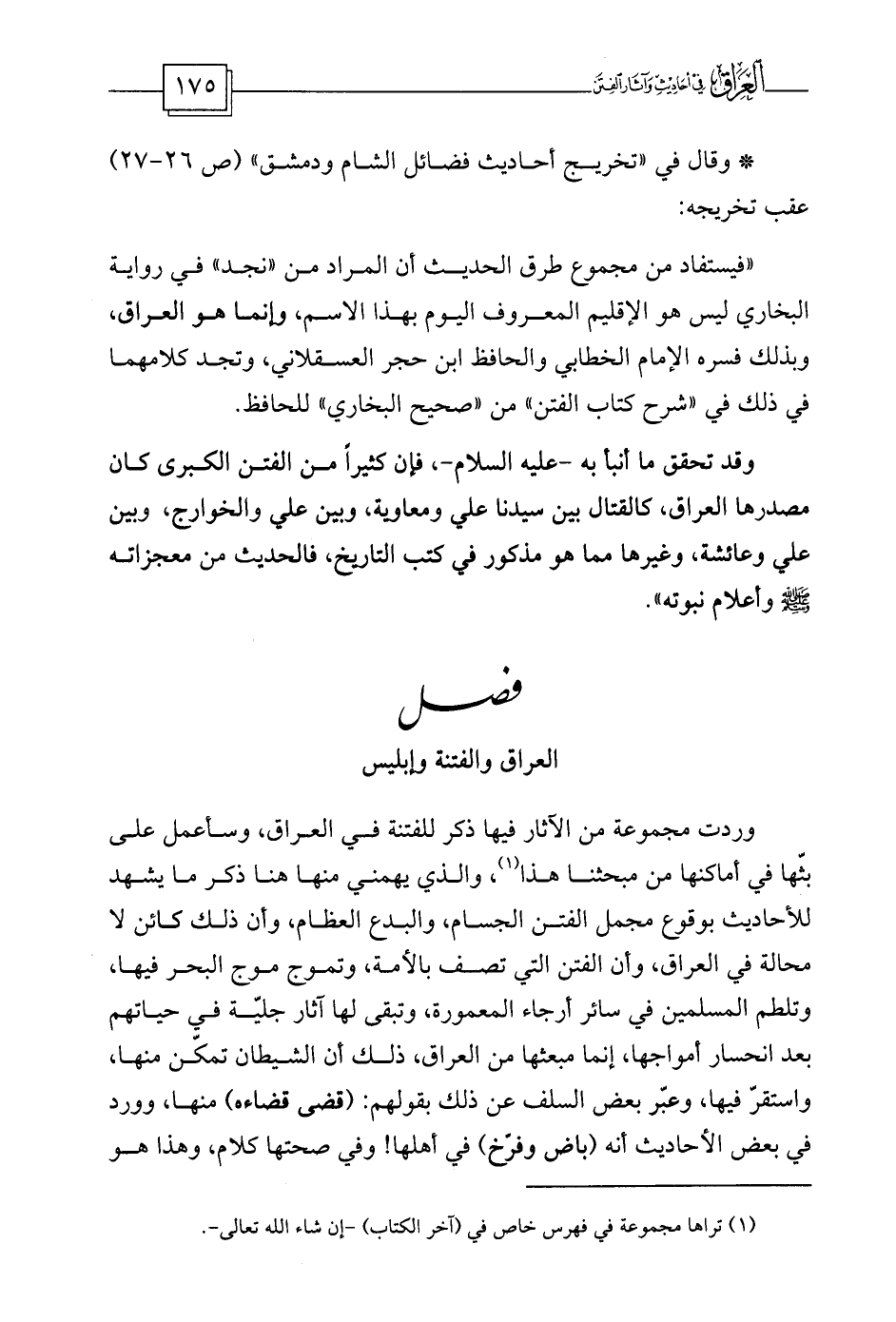 «فيستفاد من مجموع طرق الحديث أن المراد من «نجد» في رواية البخاري ليس هو الإقليم المعروف اليوم بهذا الاسم، وإنما هو العراق، وبذلك فسره الإمام الخطابي والحافظ ابن حجر العسقلاني، وتجد كلامهما في ذلك في «شرح كتاب الفتن» من «صحيح البخاري» للحافظ.