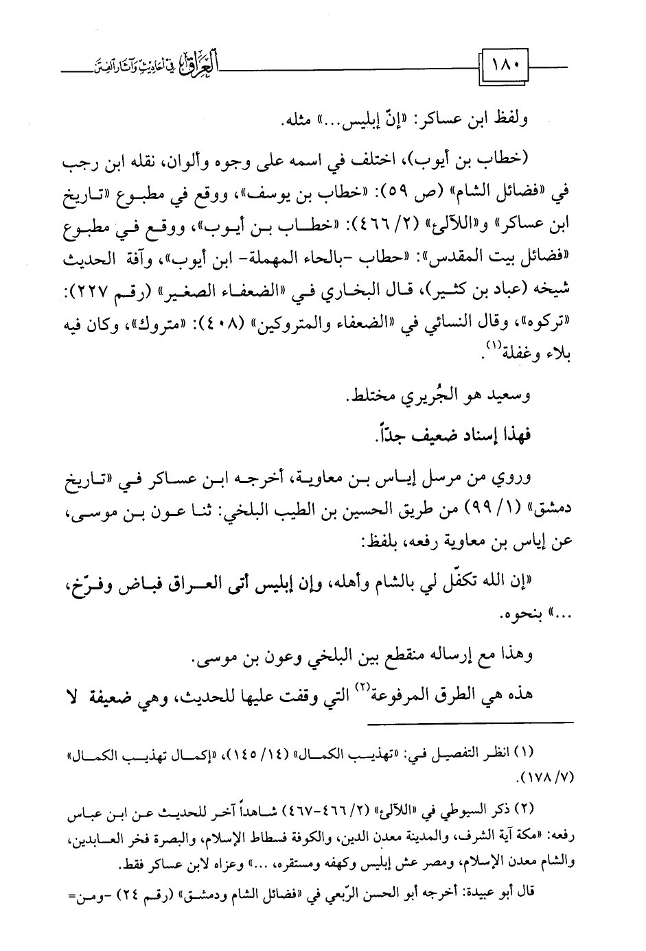 (¬2) ذكر السيوطي في «اللآلئ» (2/466-467) شاهداً آخر للحديث عن ابن عباس رفعه: «مكة آية الشرف، والمدينة معدن الدين، والكوفة فسطاط الإسلام، والبصرة فخر العابدين، والشام معدن الإسلام، ومصر عش إبليس وكهفه ومستقره، ... » وعزاه لابن عساكر فقط.