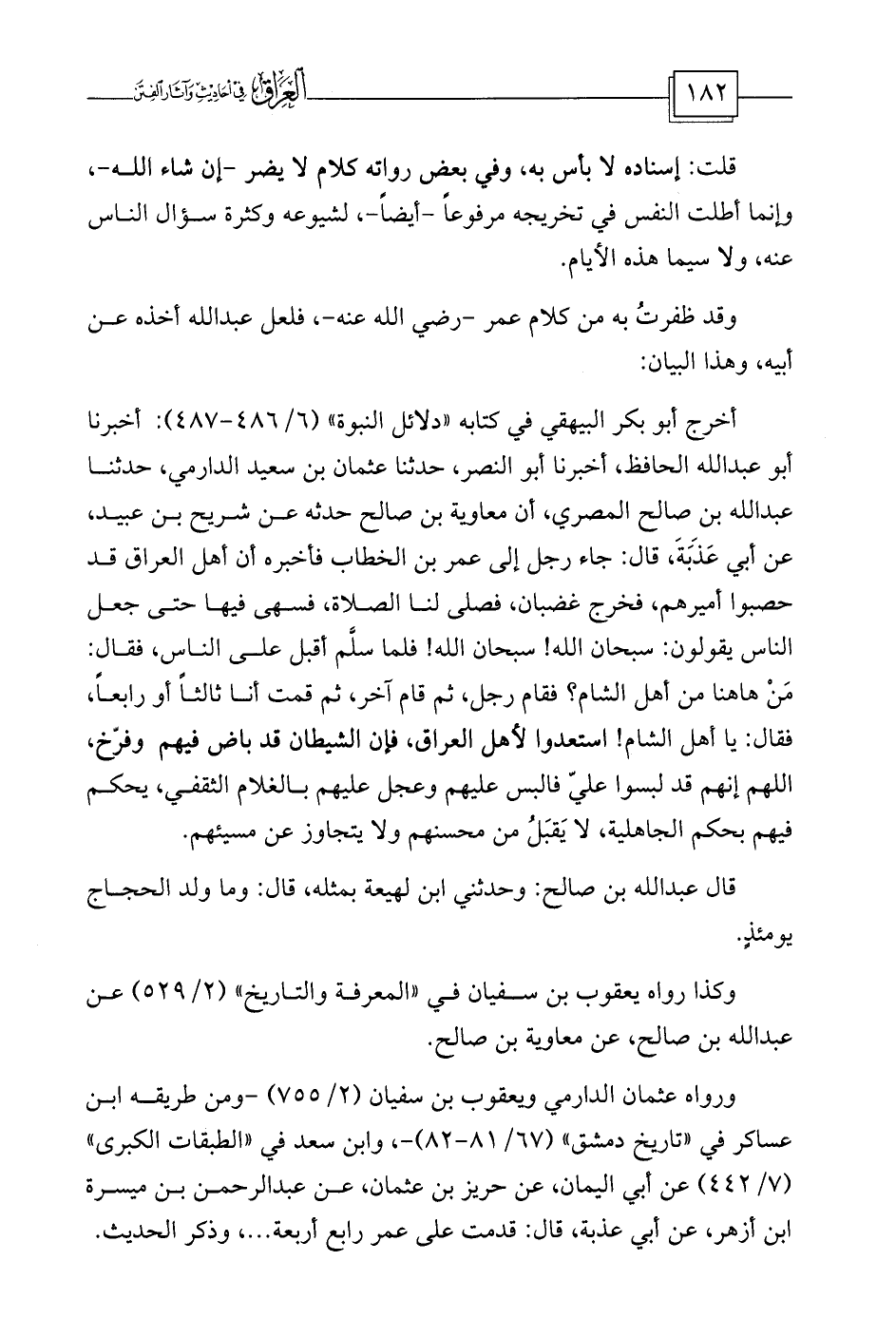 أخرج أبو بكر البيهقي في كتابه «دلائل النبوة» (6/486-487) : أخبرنا أبو عبد الله الحافظ، أخبرنا أبو النصر، حدثنا عثمان بن سعيد الدارمي، حدثنا عبد الله بن صالح المصري، أن معاوية بن صالح حدثه عن شريح بن عبيد، عن أبي عَذَبَةَ، قال: جاء رجل إلى عمر بن الخطاب فأخبره أن أهل العراق قد حصبوا أميرهم، فخرج غضبان، فصلى لنا الصلاة، فسهى فيها حتى جعل الناس يقولون: سبحان الله! سبحان الله! فلما سلَّم أقبل على الناس، فقال: مَنْ هاهنا من أهل الشام؟ فقام رجل، ثم قام آخر، ثم قمت أنا ثالثاً أو رابعاً، فقال: يا أهل الشام! استعدوا لأهل العراق، فإن الشيطان قد باض فيهم وفرّخ، اللهم إنهم قد لبسوا عليّ فالبس عليهم وعجل عليهم بالغلام الثقفي، يحكم فيهم بحكم الجاهلية، لا يَقبَلُ من محسنهم ولا يتجاوز عن مسيئهم.