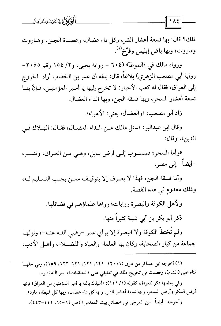 ورواه مالك في «الموطأ» (604 - رواية يحيى، و2/154 رقم 2055- رواية أبي مصعب الزهري) بلاغاً، قال: بلغه أن عمر بن الخطاب أراد الخروج إلى العراق، فقال له كعب الأحبار: لا تخرج إليها يا أمير المؤمنين، فإنّ بها تسعة أعشار السحر، وبها فسقة الجن، وبها الداء العضال.