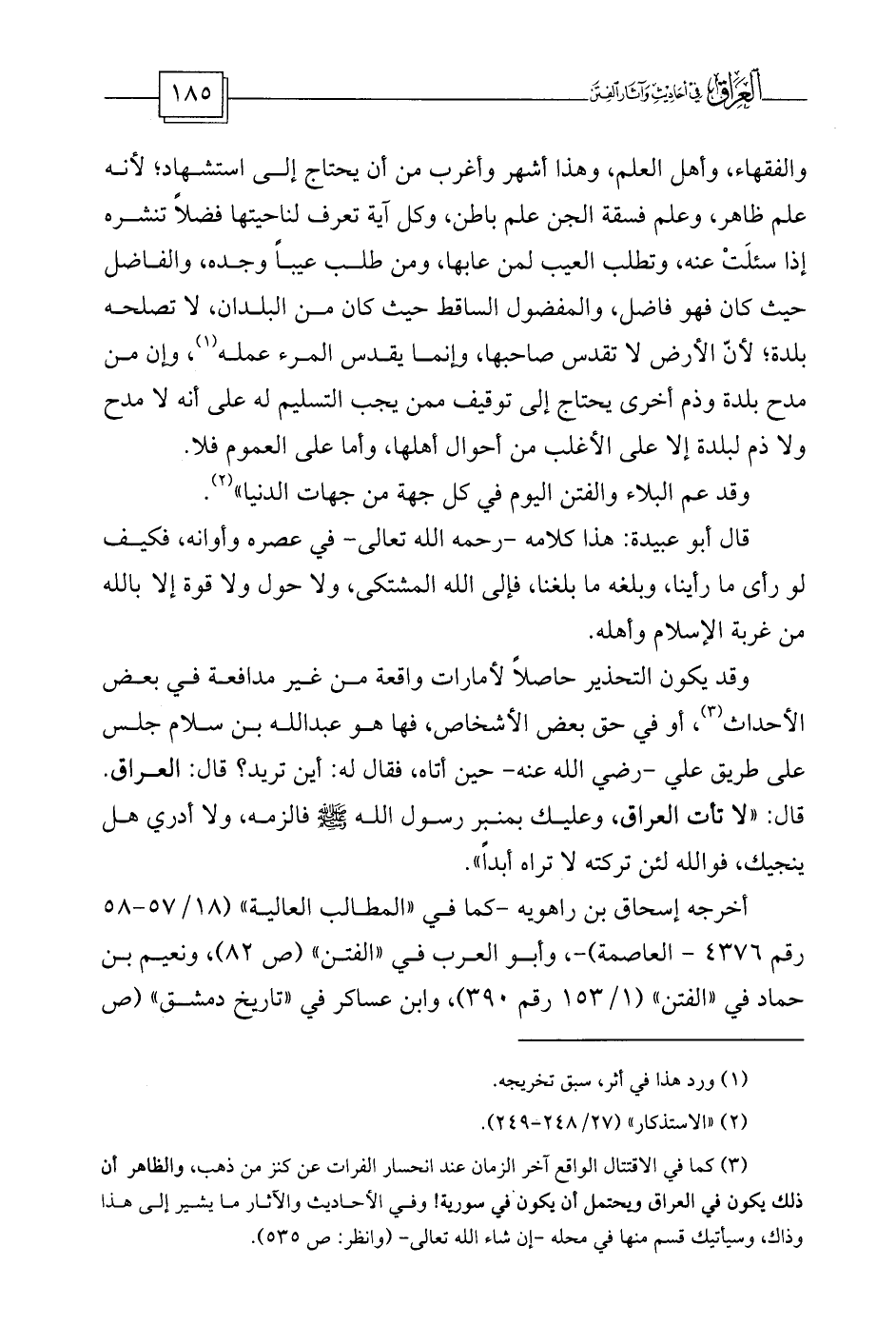 (¬3) كما في الاقتتال الواقع آخر الزمان عند انحسار الفرات عن كنز من ذهب، والظاهر أن ذلك يكون في العراق ويحتمل أن يكون في سورية! وفي الأحاديث والآثار ما يشير إلى هذا وذاك، وسيأتيك قسم منها في محله -إن شاء الله تعالى- (وانظر: ص 535) .