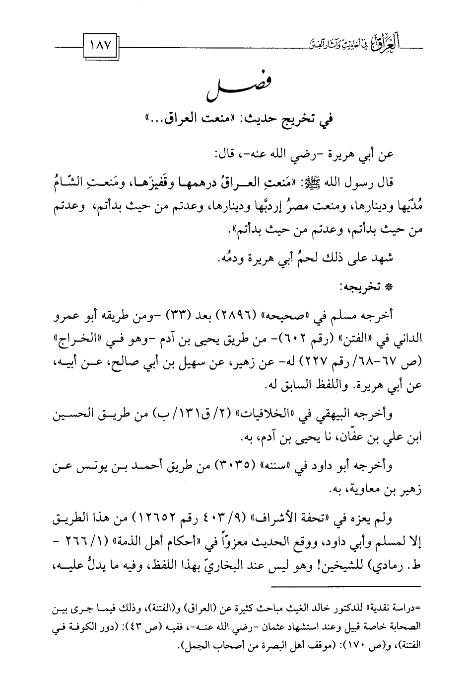 = دراسة نقدية» للدكتور خالد الغيث مباحث كثيرة عن (العراق) و (الفتنة) ، وذلك فيما جرى بين الصحابة خاصة قبيل وعند استشهاد عثمان -رضي الله عنه-، ففيه (ص 43) : (دور الكوفة في الفتنة) ، و (ص 170) : (موقف أهل البصرة من أصحاب الجمل) .