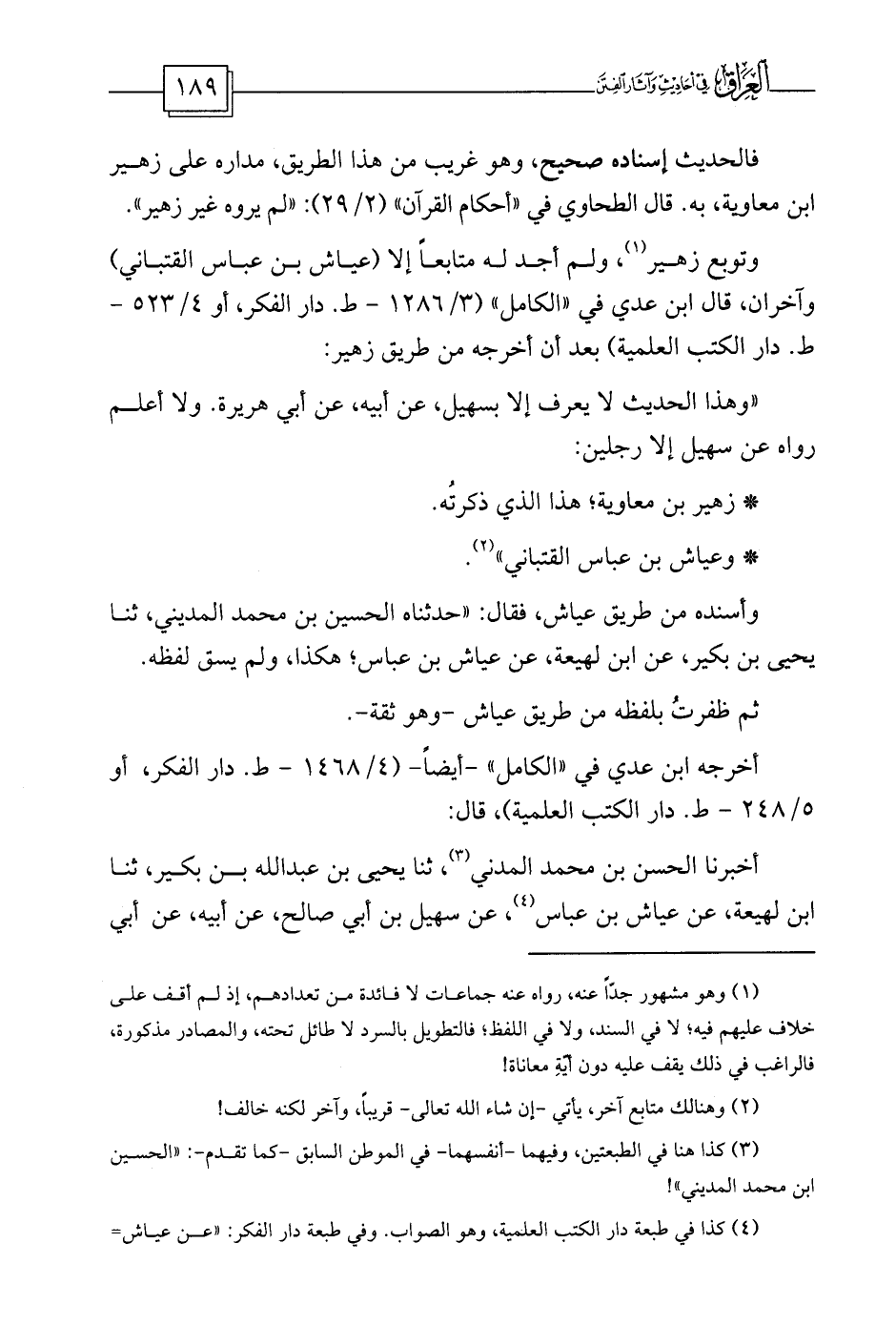 وتوبع زهير (¬1) ، ولم أجد له متابعاً إلا (عياش بن عباس القتباني) وآخران، قال ابن عدي في «الكامل» (3/1286 - ط. دار الفكر، أو 4/523 - ط. دار الكتب العلمية) بعد أن أخرجه من طريق زهير: