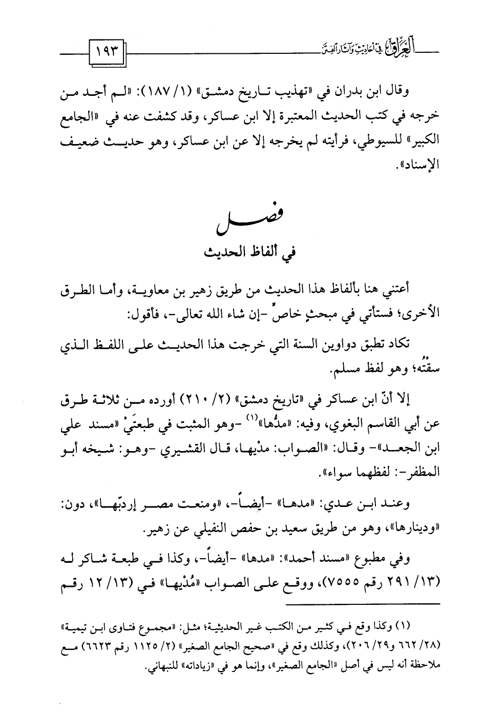 (¬1) وكذا وقع في كثير من الكتب غير الحديثية؛ مثل: «مجموع فتاوى ابن تيمية» (28/662 و29/206) ، وكذلك وقع في «صحيح الجامع الصغير» (2/1125 رقم 6623) مع ملاحظة أنه ليس في أصل «الجامع الصغير» ، وإنما هو في «زياداته» للنبهاني.