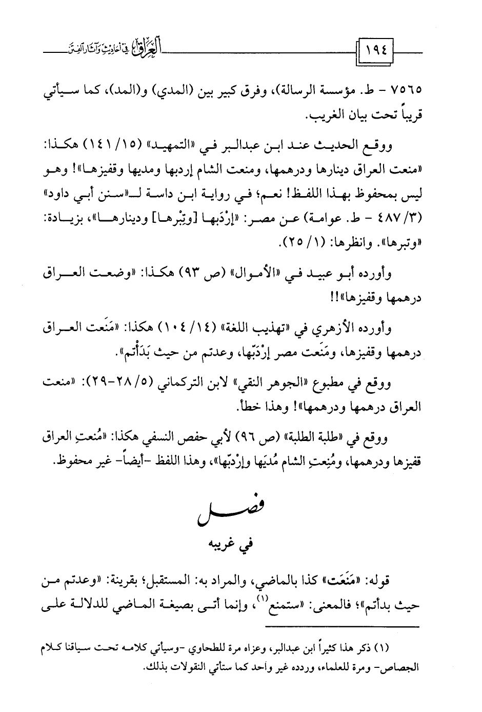 وأورده أبو عبيد في «الأموال» (ص 93) هكذا: «وضعت العراق درهمها وقفيزها» !!