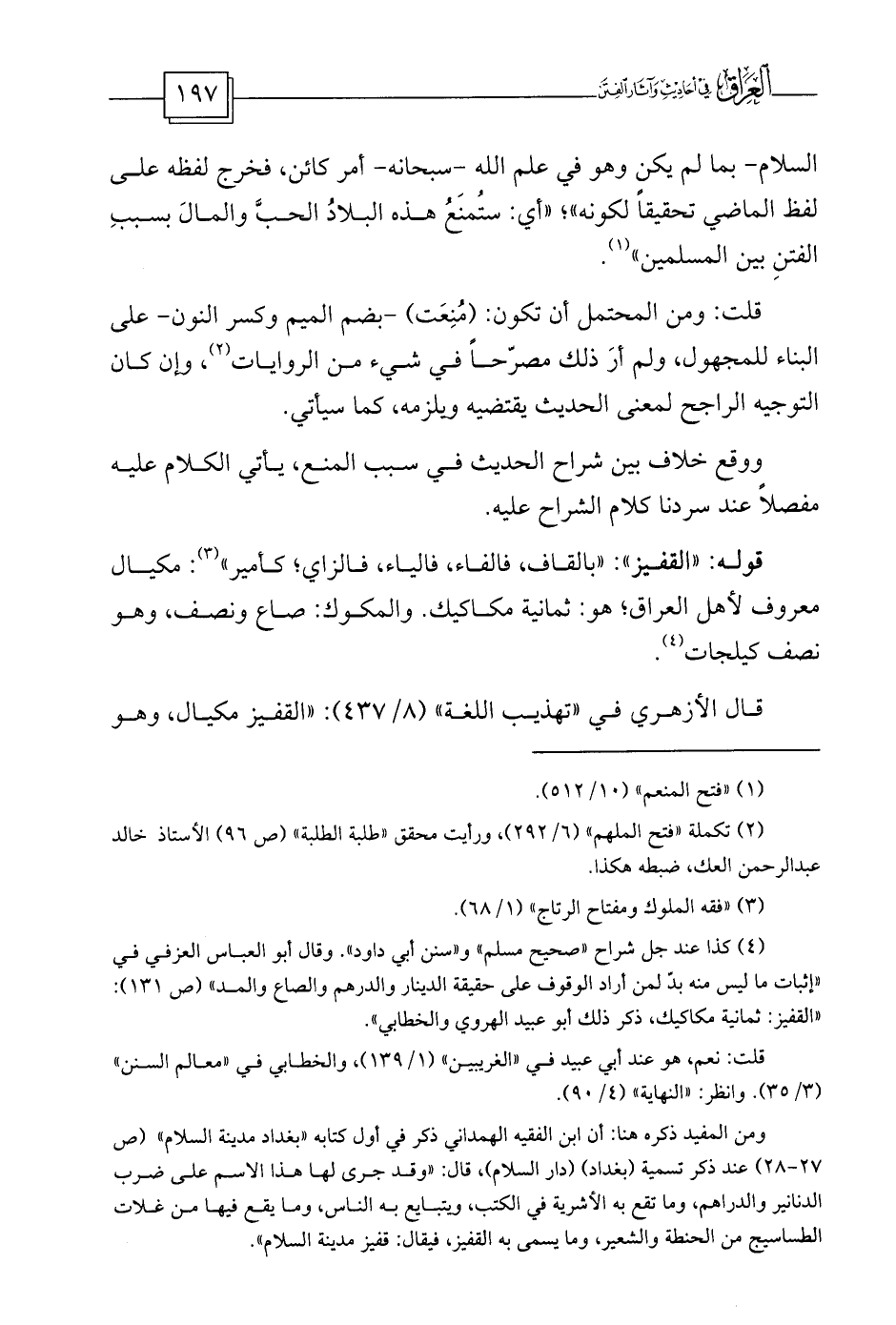 (¬4) كذا عند جل شراح «صحيح مسلم» و «سنن أبي داود» . وقال أبو العباس العزفي في «إثبات ما ليس منه بدّ لمن أراد الوقوف على حقيقة الدينار والدرهم والصاع والمد» (ص 131) : «القفيز: ثمانية مكاكيك، ذكر ذلك أبو عبيد الهروي والخطابي» .