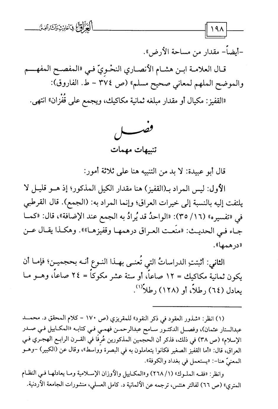 (¬1) انظر: «شذور العقود في ذكر النقود» للمقريزي (ص 170 - كلام المحقق د. محمد عبد الستار عثمان) ، وفصل الدكتور سامح عبد الرحمن فهمي في كتابه «المكاييل في صدر الإسلام» (ص 38) في ذلك، فذكر أن الحجمين المذكورين عُرِفَا في القرن الرابع الهجري في العراق، قال: «أما القفيز الصغير فكانوا يتعاملون به في البصرة وواسط» ، وقال عن (الكبير) -وهو المعنيّ هنا-: «يستعمل في بغداد والكوفة» .