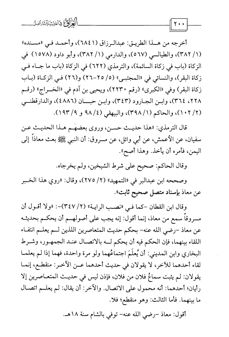أخرجه من هذا الطريق: عبد الرزاق (6841) ، وأحمد في «مسنده» (1/382) ، والطيالسي (567) ، والدارمي (1/382) ، وأبو داود (1578) في الزكاة (باب في زكاة السائمة) ، والترمذي (622) في الزكاة (باب ما جاء في زكاة البقر) ، والنسائي في «المجتبى» (5/25-26) و (26) في الزكاة (باب زكاة البقر) وفي «الكبرى» (رقم 2230) ، ويحيى بن آدم في «الخراج» (رقم 228، 364) ، وابن الجارود (343) ، وابن حبان (4886) ، والدارقطني (2/102) ، والحاكم (1/398) ، والبيهقي (4/98 و 9/193) .