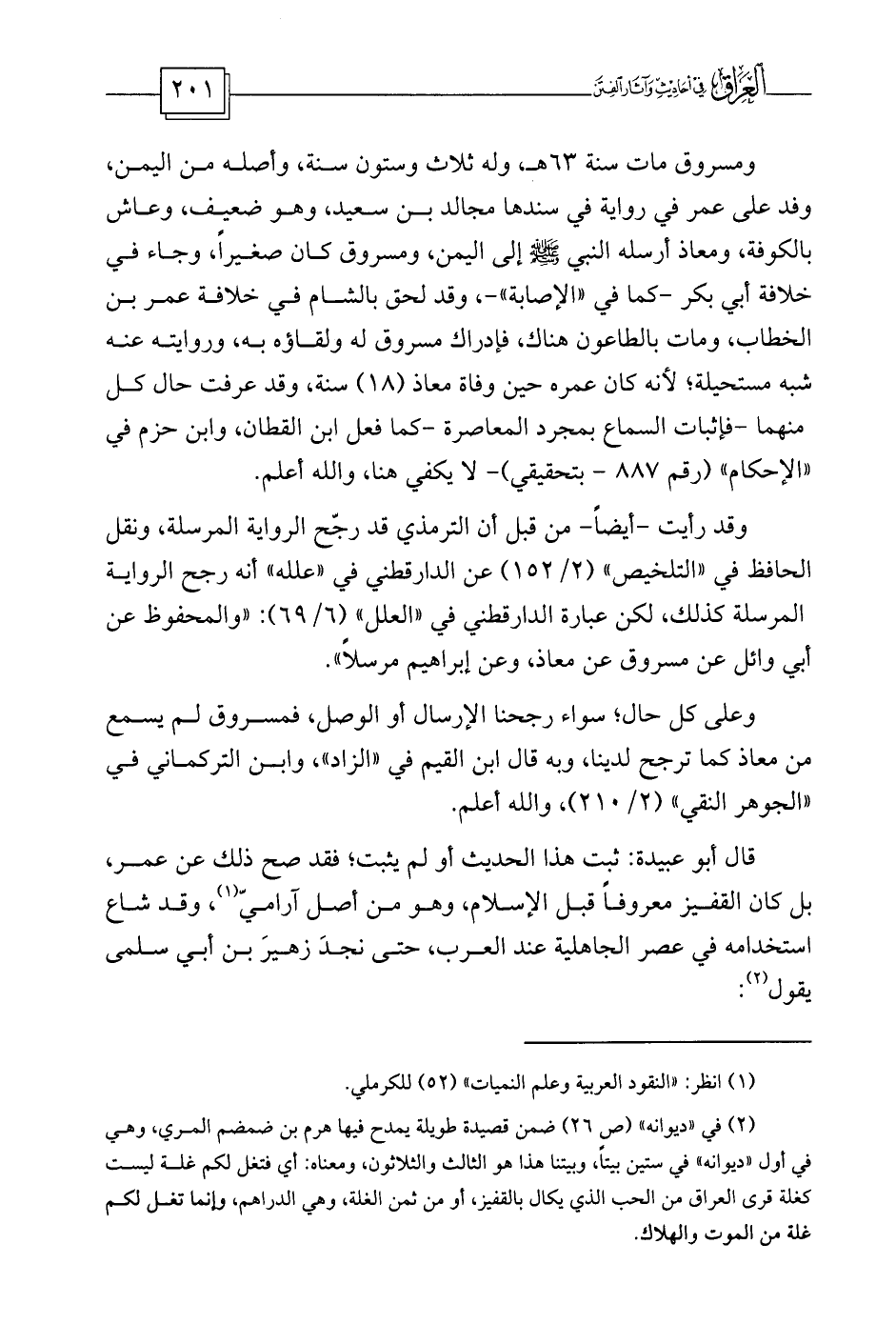 ومسروق مات سنة 63هـ، وله ثلاث وستون سنة، وأصله من اليمن، وفد على عمر في رواية في سندها مجالد بن سعيد، وهو ضعيف، وعاش بالكوفة، ومعاذ أرسله النبي صلى الله عليه وسلم إلى اليمن، ومسروق كان صغيراً، وجاء في خلافة أبي بكر -كما في «الإصابة» -، وقد لحق بالشام في خلافة عمر بن الخطاب، ومات بالطاعون هناك، فإدراك مسروق له ولقاؤه به، وروايته عنه شبه مستحيلة؛ لأنه كان عمره حين وفاة معاذ (18) سنة، وقد عرفت حال كل منهما -فإثبات السماع بمجرد المعاصرة -كما فعل ابن القطان، وابن حزم في «الإحكام» (رقم 887 - بتحقيقي) - لا يكفي هنا، والله أعلم.