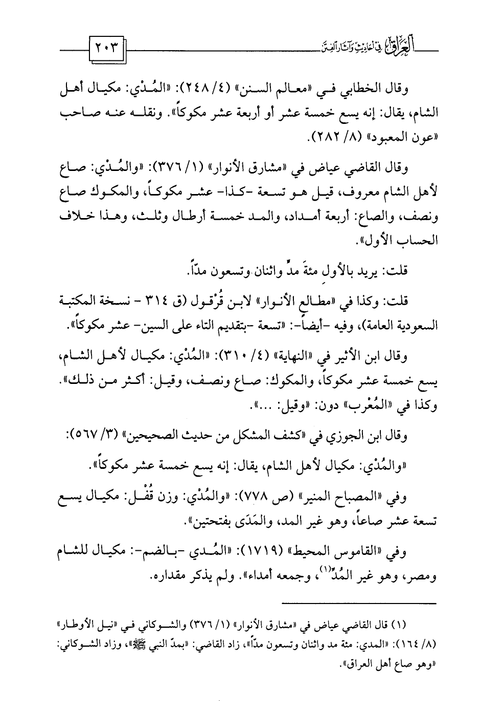 وقال القاضي عياض في «مشارق الأنوار» (1/376) : «والمُدْي: صاع لأهل الشام معروف، قيل هو تسعة -كذا- عشر مكوكاً، والمكوك صاع ونصف، والصاع: أربعة أمداد، والمد خمسة أرطال وثلث، وهذا خلاف الحساب الأول» .