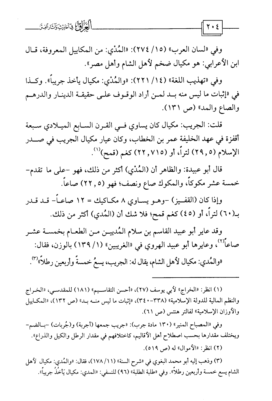 (¬1) انظر: «الخراج» لأبي يوسف (27) ، «أحسن التقاسيم» (181) للمقدسي، «الخراج والنظم المالية للدولة الإسلامية» (338-340) ، «إثبات ما ليس منه بد» (ص 132) ، «المكاييل والأوزان الإسلامية» لفالتر هنتس (ص 61) .