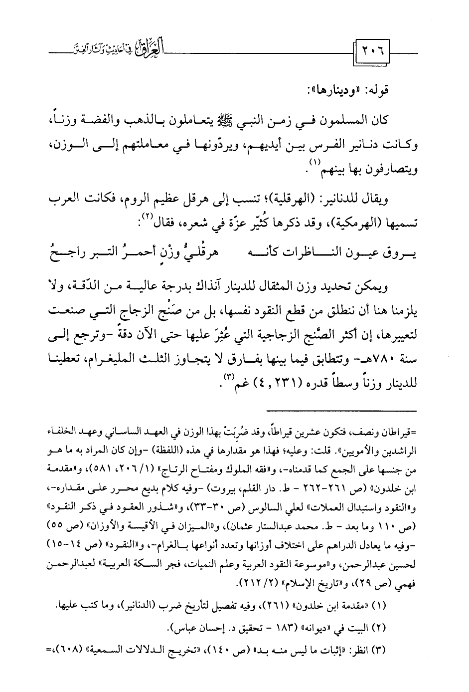 = قيراطان ونصف، فتكون عشرين قيراطاً، وقد ضُرِبَتْ بهذا الوزن في العهد الساساني وعهد الخلفاء الراشدين والأمويين» . قلت: وعليه؛ فهذا هو مقدارها في هذه (اللفظة) -وإن كان المراد به ما هو من جنسها على الجمع كما قدمناه-، و «فقه الملوك ومفتاح الرتاج» (1/206، 581) ، و «مقدمة ابن خلدون» (ص 261-262 - ط. دار القلم، بيروت) -وفيه كلام بديع محرر على مقداره-، و «النقود واستبدال العملات» لعلي السالوس (ص 30-33) ، و «شذور العقود في ذكر النقود» (ص 110 وما بعد - ط. محمد عبد الستار عثمان) ، و «الميزان في الأقيسة والأوزان» (ص 55) -وفيه ما يعادل الدراهم على اختلاف أوزانها وتعدد أنواعها بالغرام-، و «النقود» (ص 14-15) لحسين عبد الرحمن، و «موسوعة النقود العربية وعلم النميات، فجر السكة العربية» لعبد الرحمن فهمي (ص 29) ، و «تاريخ الإسلام» (2/212) .