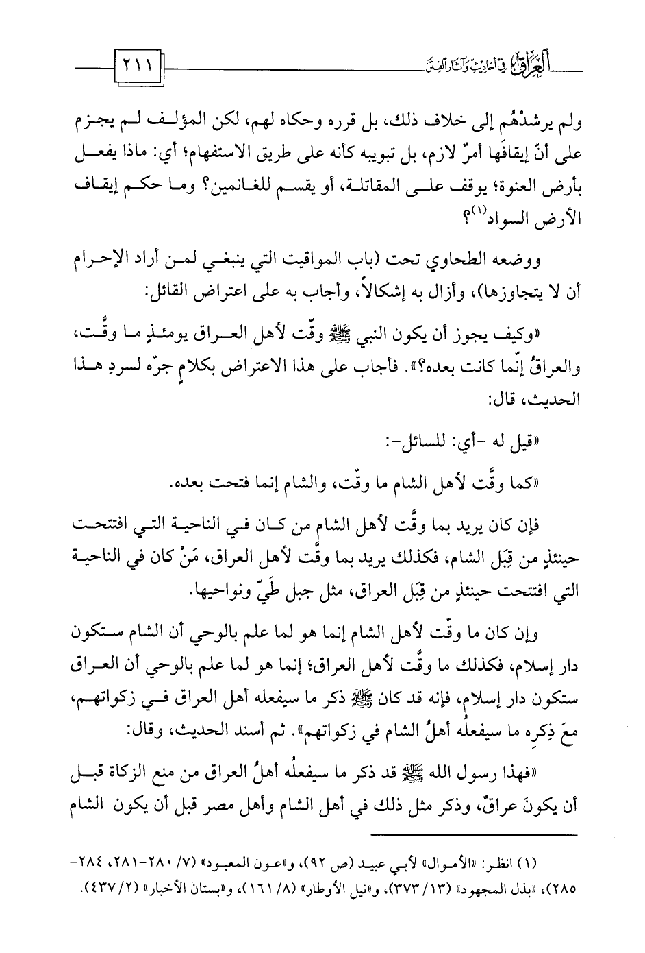 «وكيف يجوز أن يكون النبي صلى الله عليه وسلم وقّت لأهل العراق يومئذٍ ما وقَّت، والعراقُ إنّما كانت بعده؟» . فأجاب على هذا الاعتراض بكلامٍ جرّه لسردِ هذا الحديث، قال: