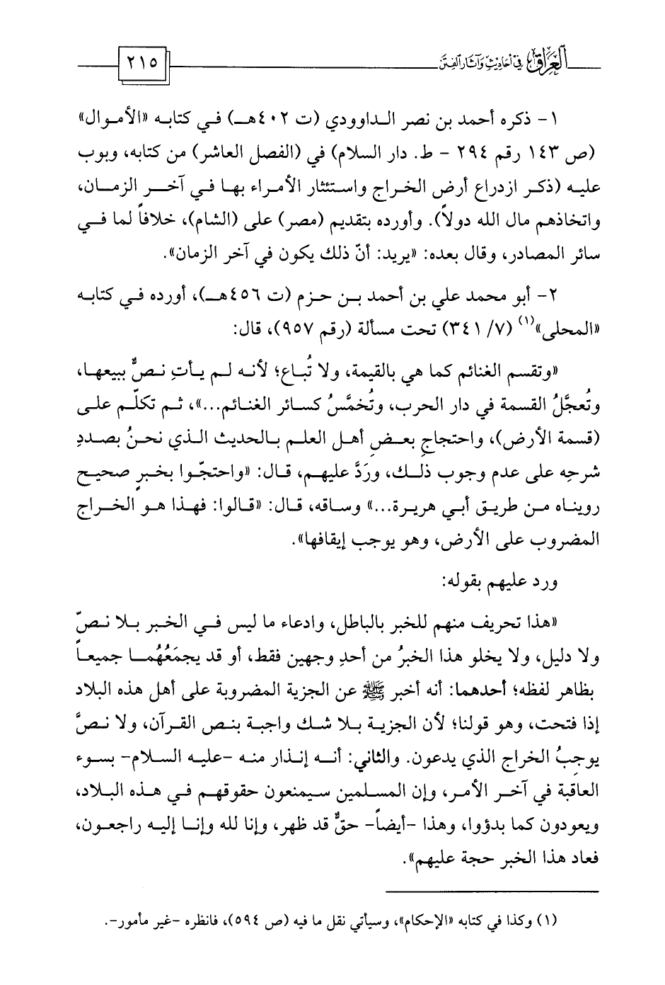 «هذا تحريف منهم للخبر بالباطل، وادعاء ما ليس في الخبر بلا نصّ ولا دليل، ولا يخلو هذا الخبرُ من أحدِ وجهين فقط، أو قد يجمَعُهُما جميعاً بظاهر لفظه؛ أحدهما: أنه أخبر صلى الله عليه وسلم عن الجزية المضروبة على أهل هذه البلاد إذا فتحت، وهو قولنا؛ لأن الجزية بلا شك واجبة بنص القرآن، ولا نصَّ يوجِبُ الخراج الذي يدعون. والثاني: أنه إنذار منه -عليه السلام- بسوء العاقبة في آخر الأمر، وإن المسلمين سيمنعون حقوقهم في هذه البلاد، ويعودون كما بدؤوا، وهذا -أيضاً- حقٌّ قد ظهر، وإنا لله وإنا إليه راجعون، فعاد هذا الخبر حجة عليهم» .