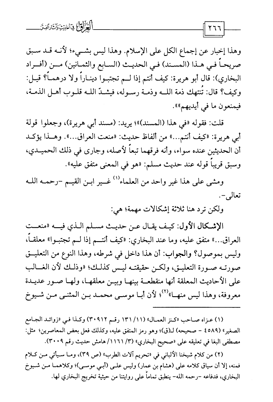 الإشكال الأول: كيف يقال عن حديث مسلم الذي فيه «منعت العراق ... » متفق عليه، وما عند البخاري: «كيف أنتم إذا لم تجتبوا» معلقاً، وليس بموصول؟ والجواب: أن هذا داخل في شرطه، وهذا النوع من التعليق صورته صورة التعليق، ولكن حقيقته ليس كذلك؛ «وذلك لأن الغالب ... على الأحاديث المعلقة أنها منقطعة بينها وبين معلقها، ولها صور عديدة ... معروفة، وهذا ليس منها» (¬2) ؛ لأن أبا موسى محمد بن المثنى من شيوخ