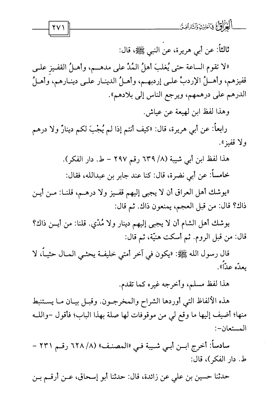 رابعاً: عن أبي هريرة، قال: «كيف أنتم إذا لم يُجْبَ لكم دينارٌ ولا درهم ولا قفيز» .