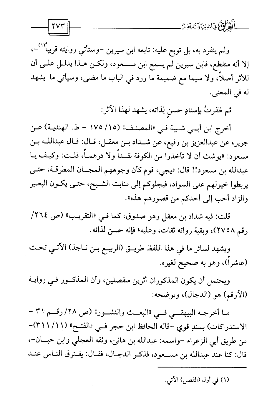 ولم ينفرد به، بل توبع عليه: تابعه ابن سيرين -وستأتي روايته قريباً (¬1) -، إلا أنه منقطع، فابن سيرين لم يسمع ابن مسعود، ولكن هذا يدلل على أن للأثر أصلاً، ولا سيما مع ضميمة ما ورد في الباب ما مضى، وسيأتي ما يشهد له في المعنى.
