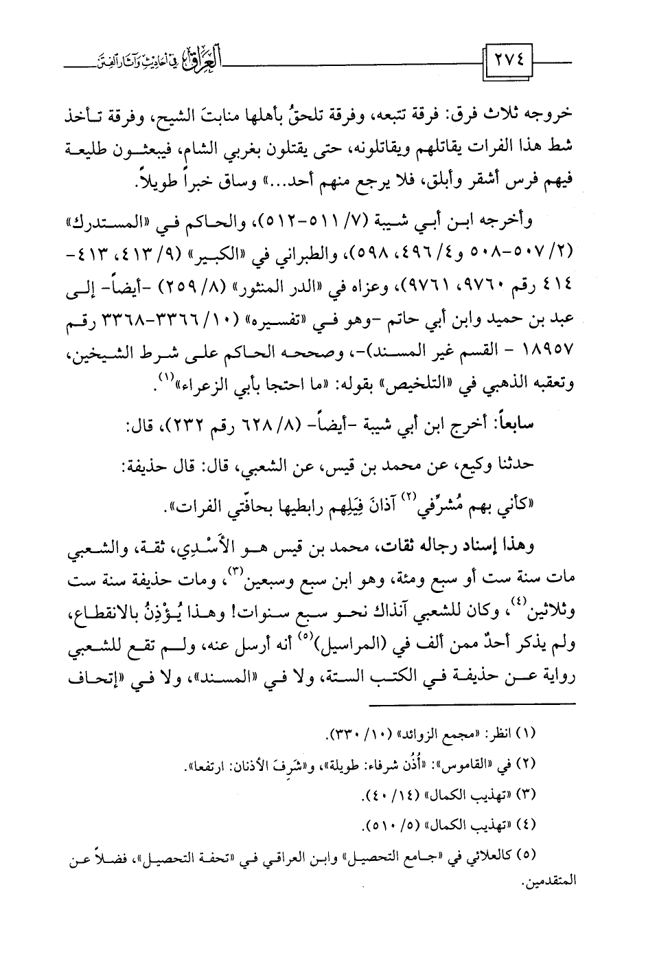 وهذا إسناد رجاله ثقات، محمد بن قيس هو الأَسْدِي، ثقة، والشعبي مات سنة ست أو سبع مئة، وهو ابن سبع وسبعين (¬3) ، ومات حذيفة سنة ست وثلاثين (¬4) ، وكان للشعبي آنذاك نحو سبع سنوات! وهذا يُؤْذِنُ بالانقطاع، ولم يذكر أحدٌ ممن ألف في (المراسيل) (¬5) أنه أرسل عنه، ولم تقع للشعبي رواية عن حذيفة في الكتب الستة، ولا في «المسند» ، ولا في «إتحاف