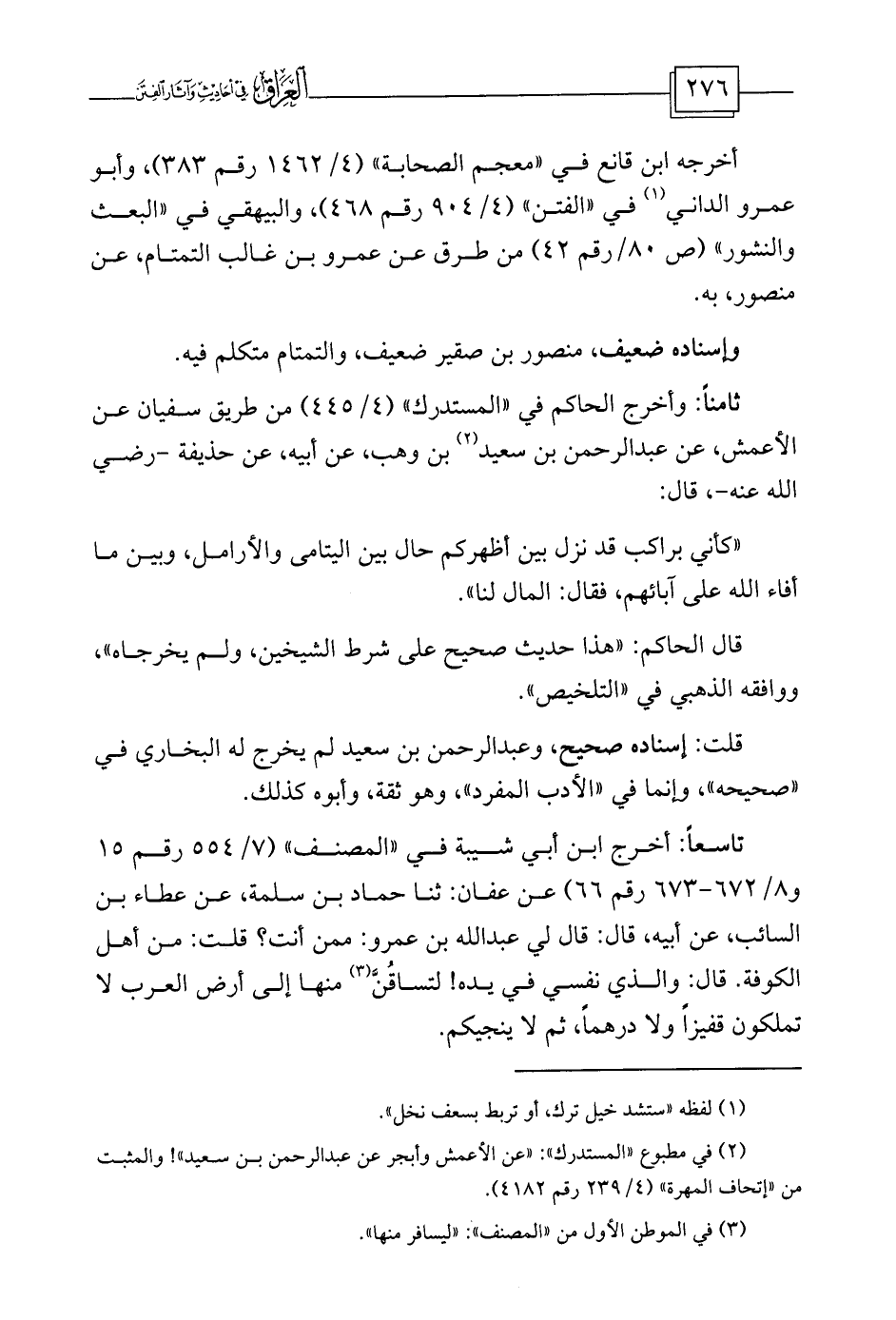 ثامناً: وأخرج الحاكم في «المستدرك» (4/445) من طريق سفيان عن الأعمش، عن عبد الرحمن بن سعيد (¬2) بن وهب، عن أبيه، عن حذيفة -رضي الله عنه-، قال: