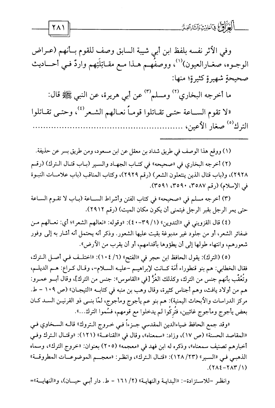 (¬2) أخرجه البخاري في «صحيحه» في كتاب الجهاد والسير (باب قتال الترك) (رقم 2928) ، و (باب قتال الذين ينتعلون الشعر) (رقم 2929) ، وكتاب المناقب (باب علامات النبوة في الإسلام) (رقم 3587، 3590، 3591) .