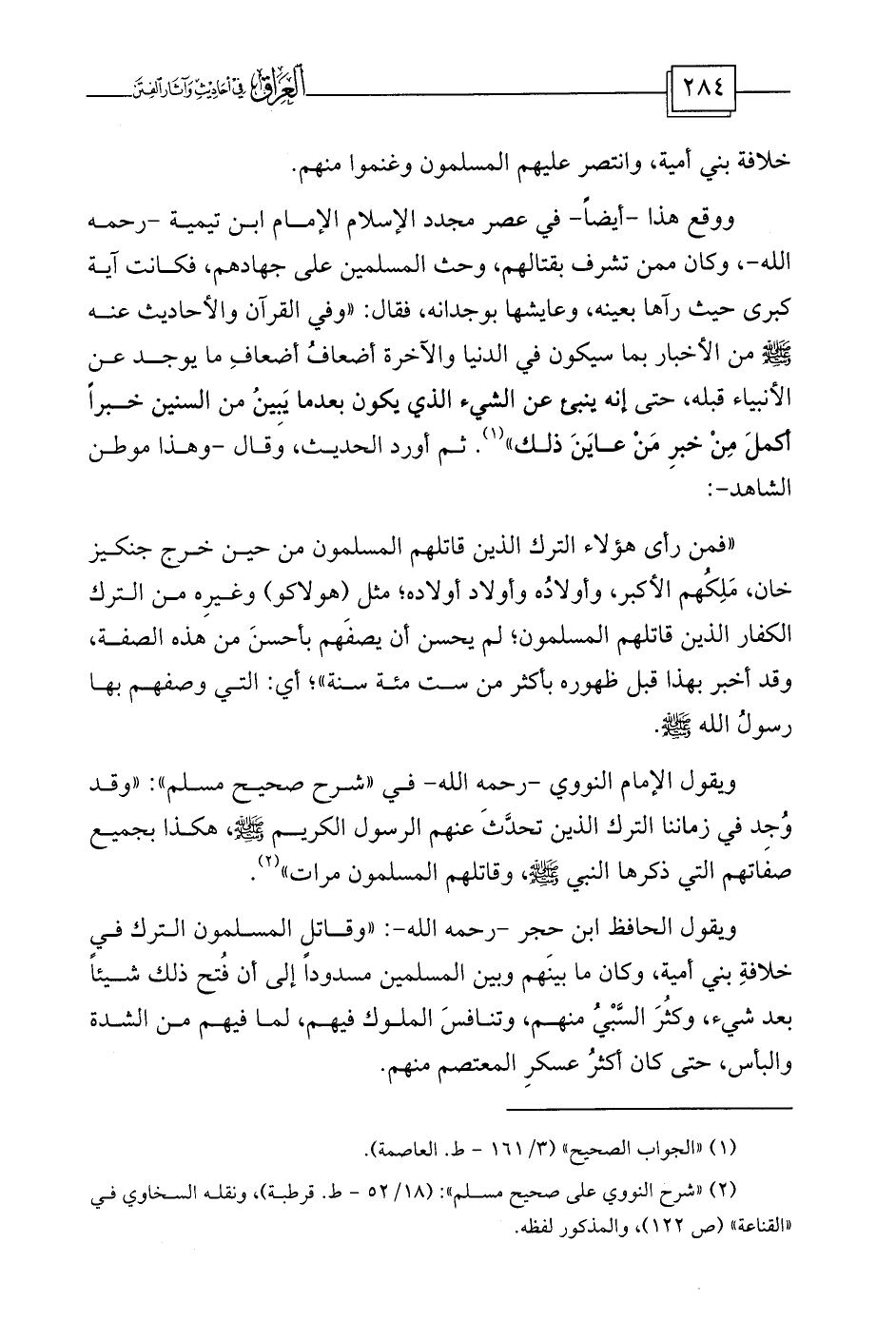 «فمن رأى هؤلاء الترك الذين قاتلهم المسلمون من حين خرج جنكيز خان، مَلِكُهم الأكبر، وأولادُه وأولاد أولاده؛ مثل (هولاكو) وغيرِه من الترك الكفار الذين قاتلهم المسلمون؛ لم يحسن أن يصفَهم بأحسنَ من هذه الصفة، وقد أخبر بهذا قبل ظهوره بأكثر من ست مئة سنة» ؛ أي: التي وصفهم بها رسولُ الله صلى الله عليه وسلم.