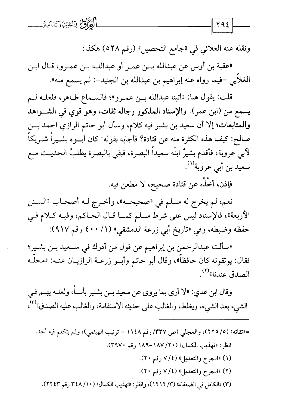 قلت: يقول هنا: «أتينا عبد الله بن عمرو» ؛ فالسماع ظاهر، فلعله لم يسمع من (ابن عمر) . والإسناد المذكور رجاله ثقات، وهو قوي في الشواهد والمتابعات؛ إلا أن سعيد بن بشير فيه كلام، وسأل أبو حاتم الرازي أحمد بن صالح: كيف هذه الكثرة منه عن قتادة؟ فأجابه بقوله: كان أبوه بشيراً شريكاً لأبي عروبة، فأقدم بشيرٌ ابنَه سعيداً البصرة، فبقي بالبصرة يطلبُ الحديث مع سعيد بن أبي عروبة (¬1) .