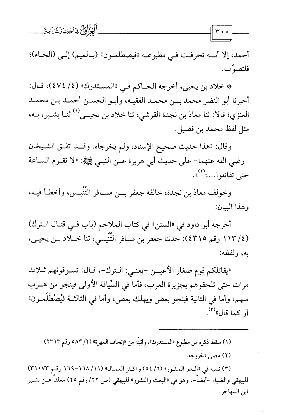 وقال: «هذا حديث صحيح الإسناد، ولم يخرجاه. وقد اتفق الشيخان -رضي الله عنهما- على حديث أبي هريرة عن النبي صلى الله عليه وسلم: «لا تقوم الساعة حتى تقاتلوا ... » (¬2) » .
