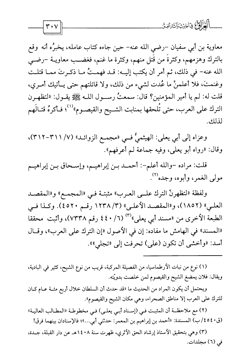 ولفظة «لتظهرنّ الترك على العرب» مثبتة في «المجمع» و «المقصد العلي» (1852) ، و «المقصد الأعلى» (3/1238 رقم 4520) . وكذا في الطبعة الأخرى من «مسند أبي يعلى» (¬3) (6/440 رقم 7338) ، وأثبت محققا «المسند» في الهامش ما مفاده: إن في الأصول «إن الترك على العرب» ، وقال أسد: «وأخشى أن تكون (على) تحرفت إلى «تجلي» » .