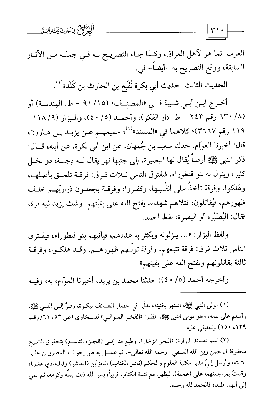 أخرج ابن أبي شيبة في «المصنف» (15/91 - ط. الهندية) أو (8/630 رقم 243 - ط. دار الفكر) ، وأحمد (5/40) ، والبزار (9/118-119 رقم 3667) ؛ كلاهما في «المسند» (¬2) ؛ جميعهم عن يزيد بن هارون، قال: أخبرنا العوّام، حدثنا سعيد بن جُمهان، عن ابن أبي بكرة، عن أبيه، قال: ذكر النبي صلى الله عليه وسلم أرضاً يُقال لها البصيرة، إلى جنبها نهر يقال له دِجلة، ذو نخل كثير، وينزل به بنو قنطوراء، فيفترق الناس ثلاث فرق: فرقة تلحق بأصلها، وهَلكوا، وفرقة تأخذُ على أنفُسِها، وكفروا، وفرقة يجعلون ذراريّهم خلف ظهورهم، فيُقاتلون، قتلاهم شهداء، يفتح الله على بقيّتهم. وشكّ يزيد فيه مرة، فقال: البُصَيْرة أو البصرة، لفظ أحمد.
