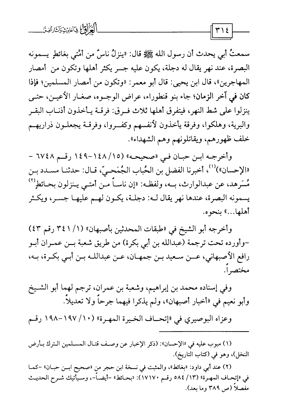 سمعتُ أبي يحدث أن رسول الله صلى الله عليه وسلم قال: «ينزلُ ناسٌ من أمَّتي بغائطٍ يسمونه البصرة، عند نهر يقال له دجلة، يكون عليه جسر يكثر أهلها وتكون من أمصار المهاجرين» ، قال ابن يحيى: قال أبو معمر: «وتكون من أمصار المسلمين؛ فإذا كان في آخر الزمان؛ جاء بنو قنطوراء، عراض الوجوه، صغار الأعين، حتى ينزلوا على شط النهر، فيتفرق أهلها ثلاث فرق: فرقة يأخذون أذناب البقر والبرية، وهلكوا، وفرقة يأخذون لأنفسهم وكفروا، وفرقة يجعلون ذراريهم خلف ظهورهم، ويقاتلونهم وهم الشهداء» .