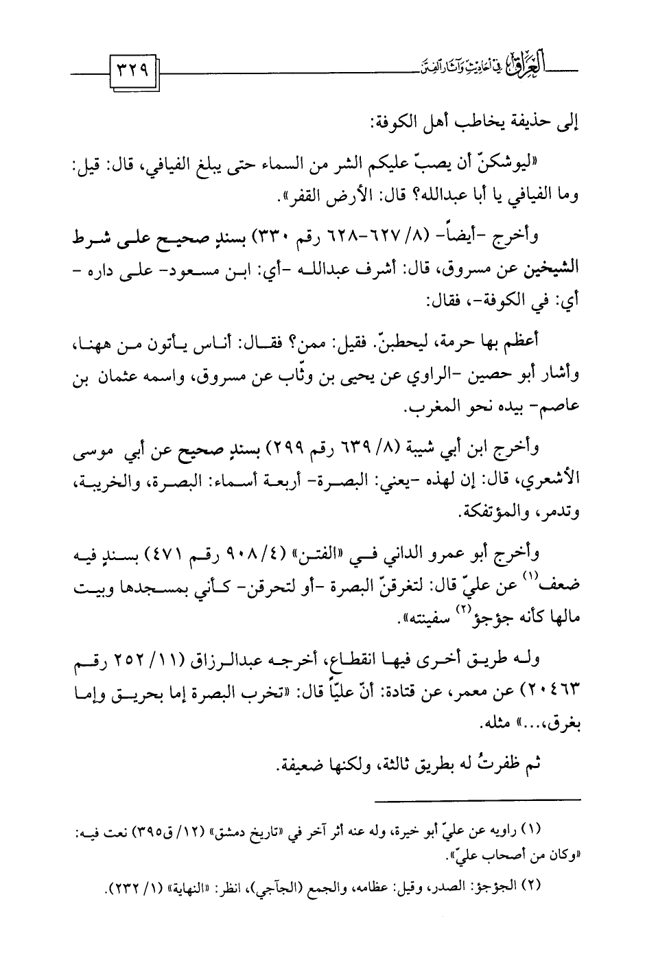 وأخرج أبو عمرو الداني في «الفتن» (4/908 رقم 471) بسندٍ فيه ضعف (¬1) عن عليّ قال: لتغرقنّ البصرة -أو لتحرقن- كأني بمسجدها وبيت مالها كأنه جؤجؤ (¬2) سفينته» .