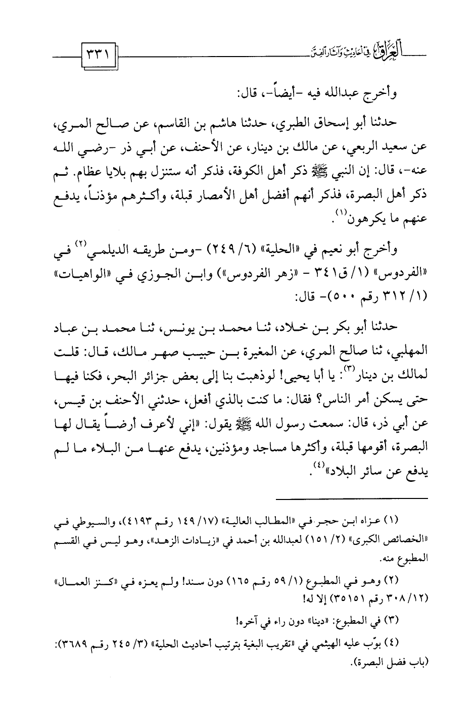 (¬4) بوّب عليه الهيثمي في «تقريب البغية بترتيب أحاديث الحلية» (3/245 رقم 3689) : (باب فضل البصرة) .