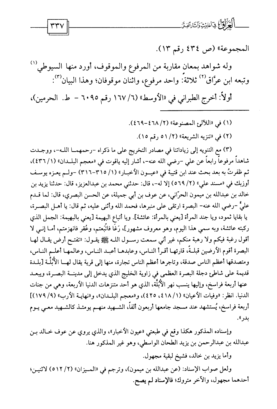 (¬3) مع التنويه إلى زياداتنا في مصادر التخريج على ما ذكراه -رحمهما الله-، ووجدت شاهداً مرفوعاً رابعاً عن علي -رضي الله عنه-، أشار إليه ياقوت في «معجم البلدان» (1/436) ، ثم ظفرتُ به بعد بحث عند ابن قتيبة في «عيون الأخبار» (1/315-316) -ولم يعزه يوسف أوزبك في «مسند علي» (2/569) إلا له-، قال: حدثني محمد بن عبد العزيز، قال: حدثنا يزيد بن خالد بن عبد الله بن ميمون الحرّاني، عن عوف بن أبي جميلة، عن الحسن البصري، قال: لما قدم عليٌّ -رضي الله عنه- البصرة ارتقى على منبرها، فحمد الله وأثنى عليه، ثم قال: يا أهل البصرة، يا بقايا ثمود، ويا جند المرأة [يعني بالمرأة: عائشة] . ويا أتباع البهيمة [يعني بالبهيمة: الجمل الذي ركبته عائشة، وبه سمي هذا اليوم، وهو معروف مشهور] ، رَغَا فاتّبَعتم، وعُقر فانهزمتم، أما إني لا أقول رغبة فيكم ولا رهبة منكم، غير أني سمعت رسول الله - صلى الله عليه وسلم - يقول: «تفتح أرض يقال لها البصرة أقوم الأرضين قبلةً، قارئها أقرأ الناس، وعابدها أعبد الناس، وعالمها أعلم الناس، ومتصدقها أعظم الناس صدقة، وتاجرها أعظم الناس تجارة، منها إلى قرية يقال لها الأُبُلَّة [بلدة قديمة على شاطئ دجلة البصرة العظمى في زاوية الخليج الذي يدخل إلى مدينة البصرة، ويبعد عنها أربعة فراسخ، وإليها ينسب نهر الأُبُلَّة، الذي هو أحد متنزهات الدنيا الأربعة، وهي من جنات الدنيا. انظر: «وفيات الأعيان» (1/418، 425) ، و «معجم البلدان» ، و «نهاية الأرب» (9/179) ] أربعة فراسخ، يُستشهد عند مسجد جامعها أربعون ألفاً، الشهيد منهم يومئذ كالشهيد معي يوم بدر» .